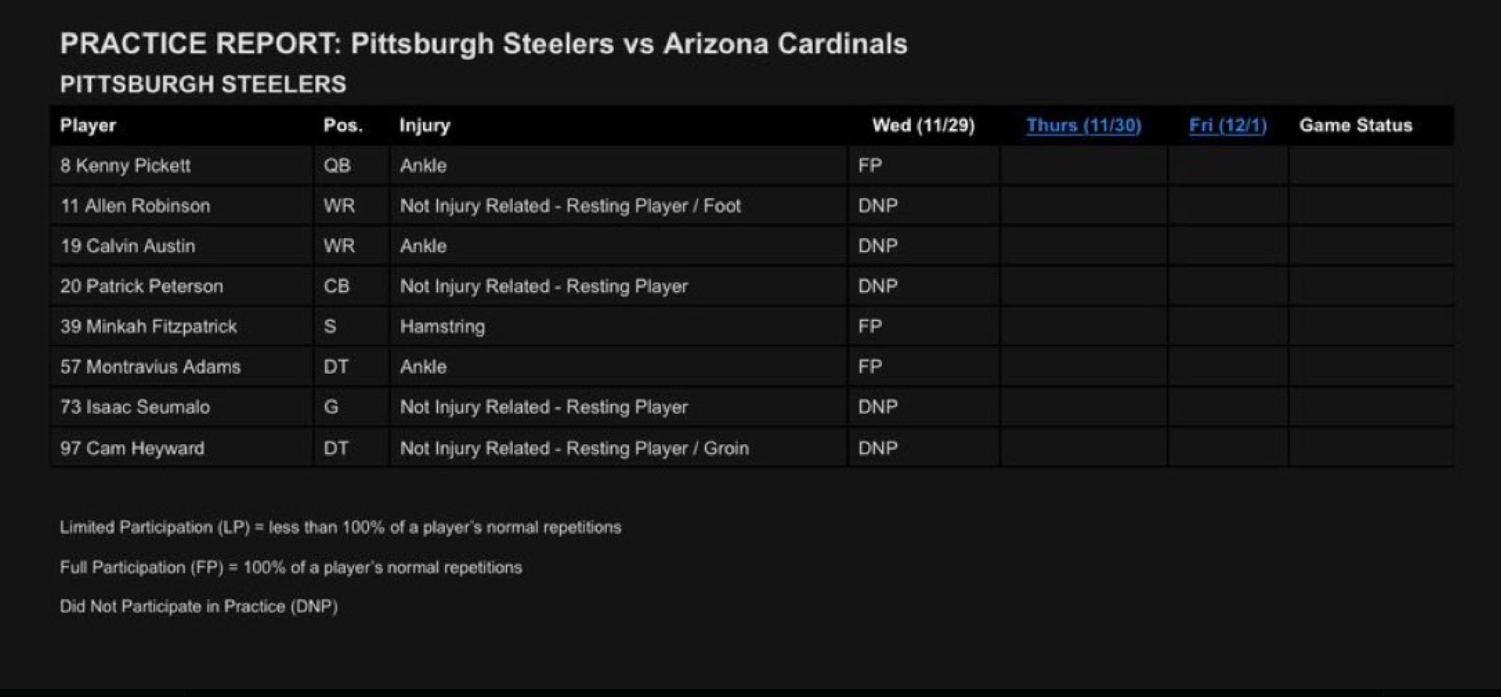 Steelers Injury Report Week 13, Wednesday