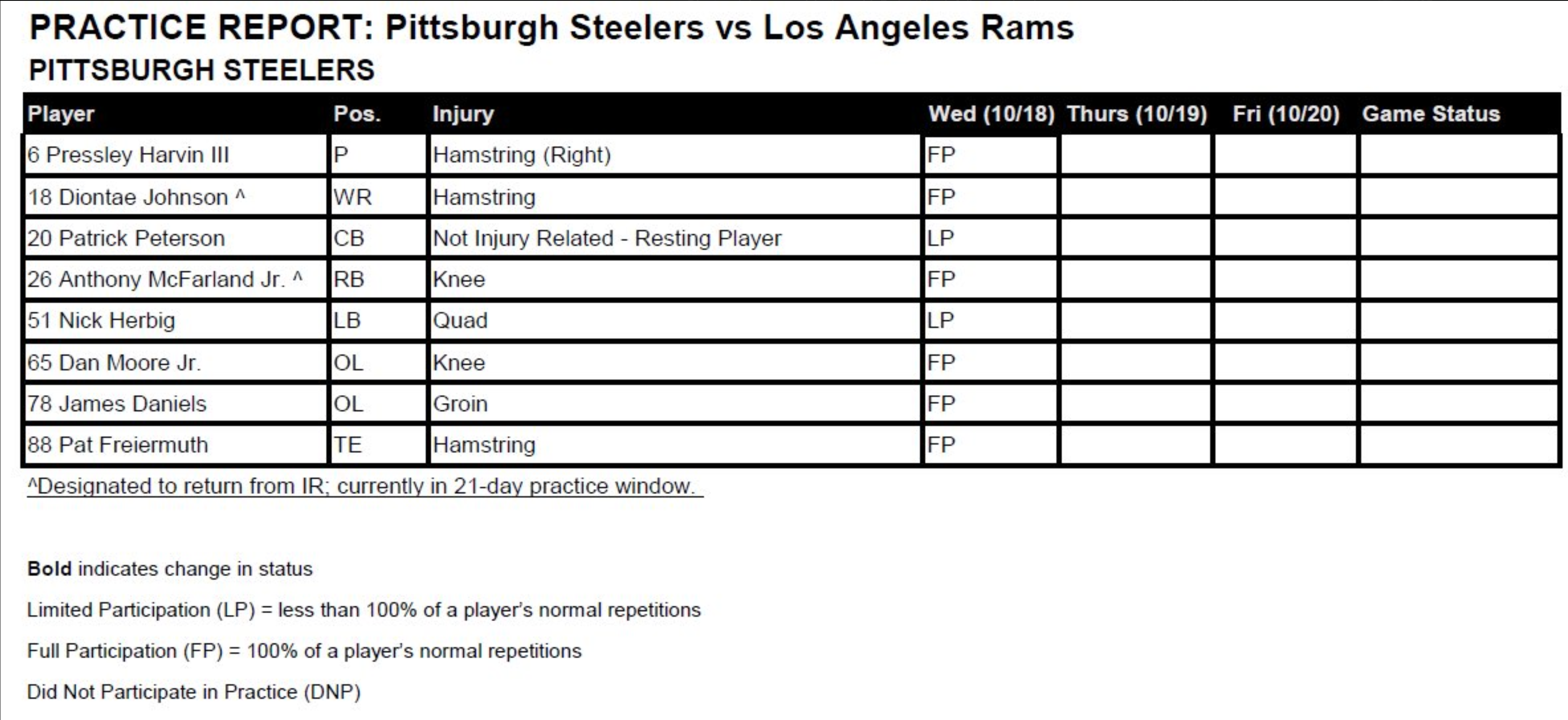 Looking to make good on the impressions left by Mike Tomlin on Tuesday, here is the first official injury report of the week:
