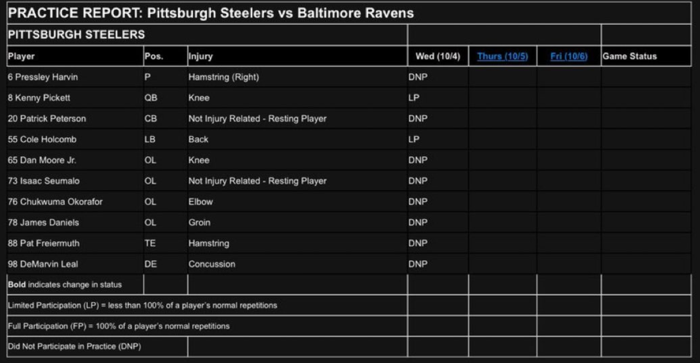 - Pressley Harvin didn't punt at all last week and forced the Steelers to sign another punter, so seeing him still as a DNP isn't a great sign