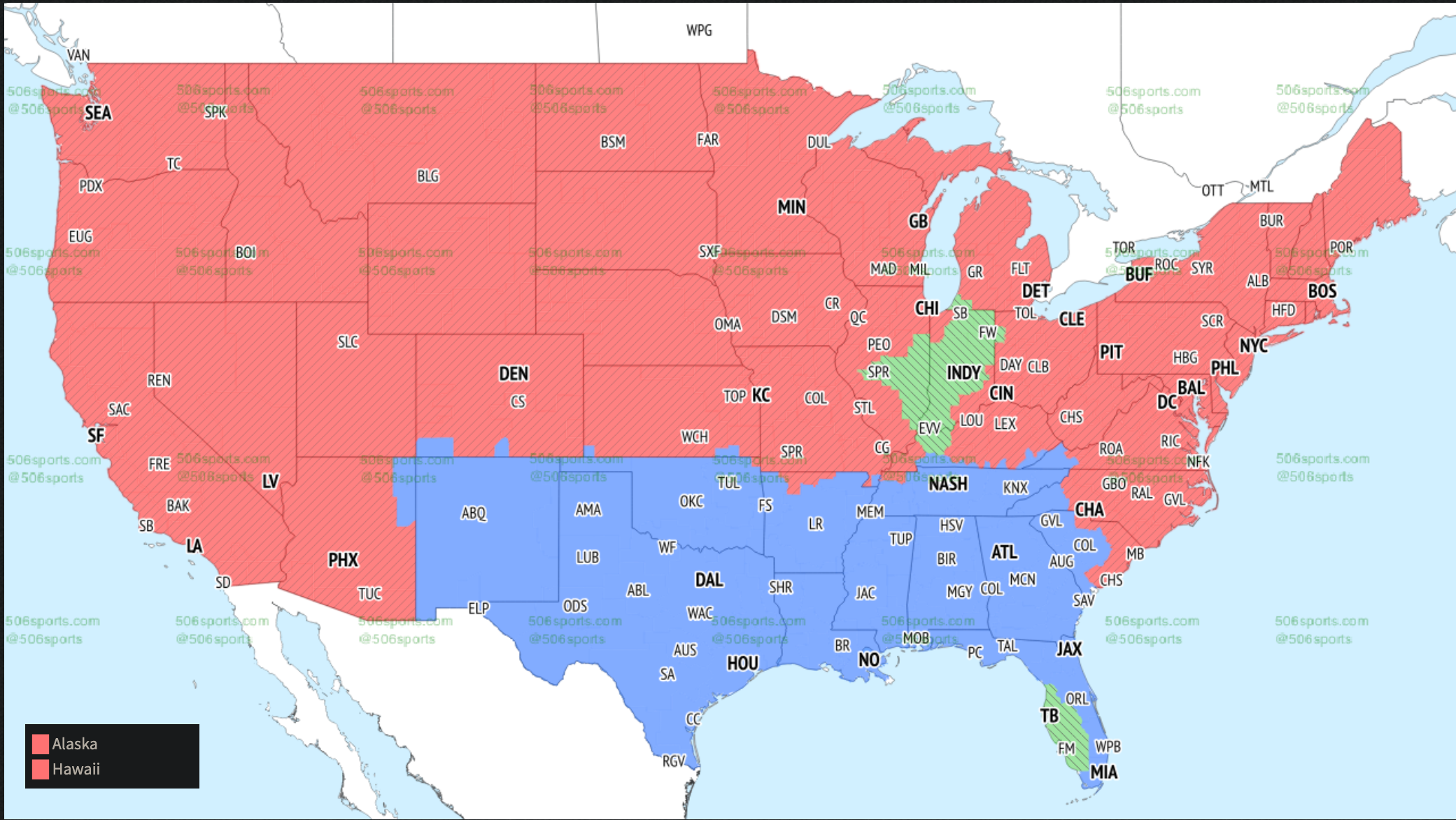 The portion of the country in blue will have Jaguars and Texans, while the green will have Bucs and Colts.