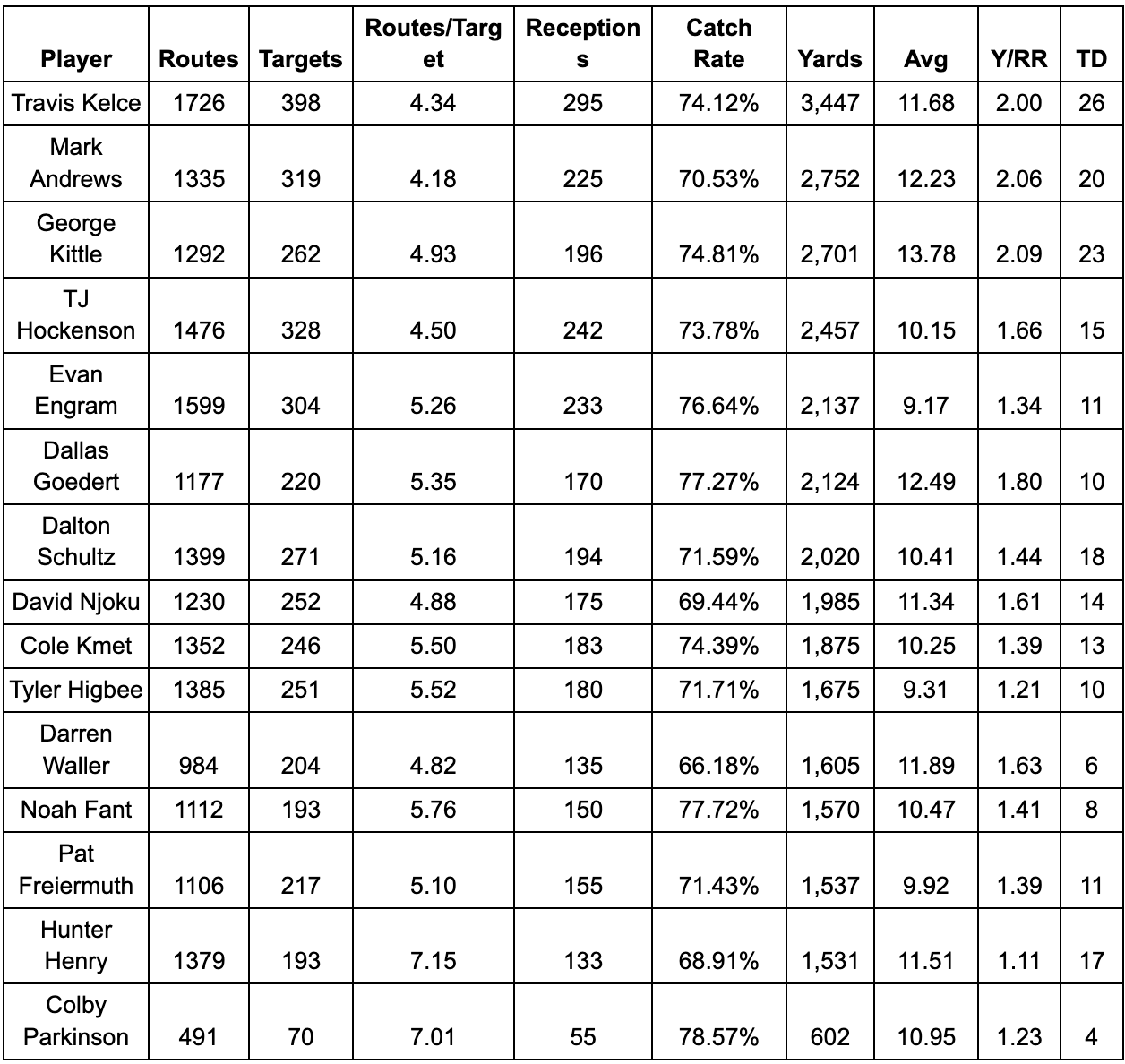 To summarize he is 11th in targets, 9th in routes per target, 11th in receptions, 11th in catch rate, 13th in receiving yards and yards per catch, 10th in yards per route run and 14th in touchdowns. He is clearly a top-15 tight end in the NFL.