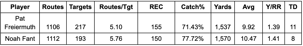 With a similar number of routes run, Freiermuth has more targets, catches and touchdowns, while Fant has outproduced Freiermuth in catch rate, receiving yards, yards per catch. The two are almost identical in terms of their efficiency (yards per route run).