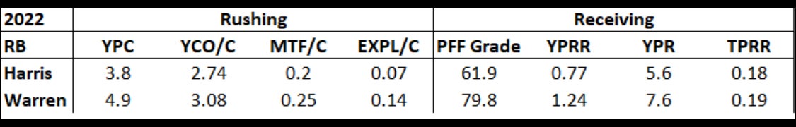 Here's the problem though; when you take a peek behind the curtain and compare Najee's advanced metrics to Steelers backup RB Jaylen Warren's, the discrepancy is mind-boggling: