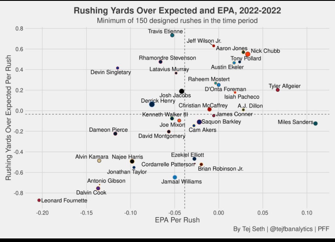 Unfortunately for Harris, his dot is in the lower left, meaning he has performed sub-par in both expected points added per play (how much of an impact he has on the score of the game) and expected rushing yards which is determined by the size of the hole in front of him.