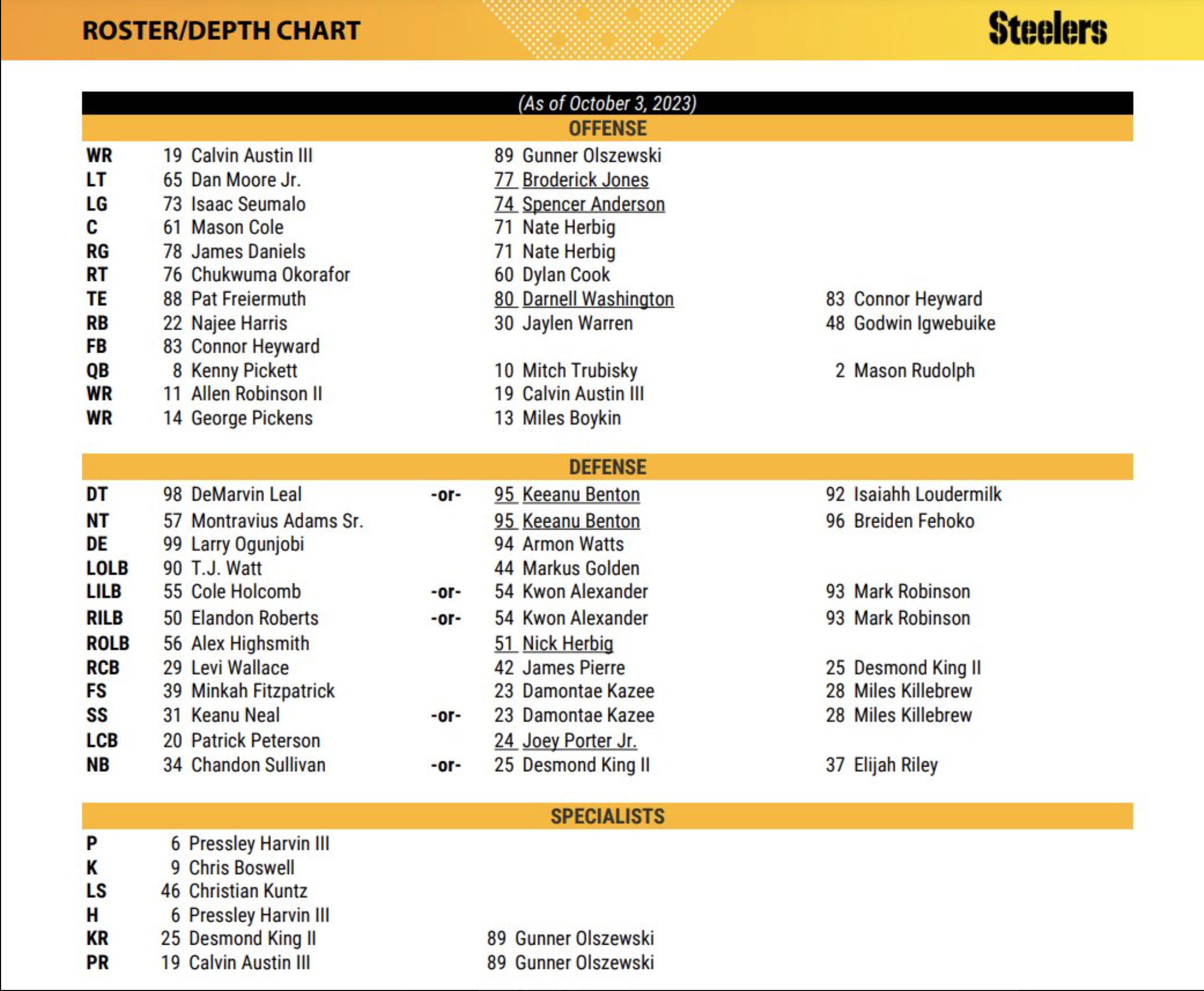 The Pittsburgh Steelers released an updated depth chart on Tuesday, and it included a change at Nickel or slot corner. For the first time all year, Chandon Sulliavan is not listed as the sole starter, with an "or" now in between him and Desmond King. DC Teryl Austin was asked about that change on Thursday: