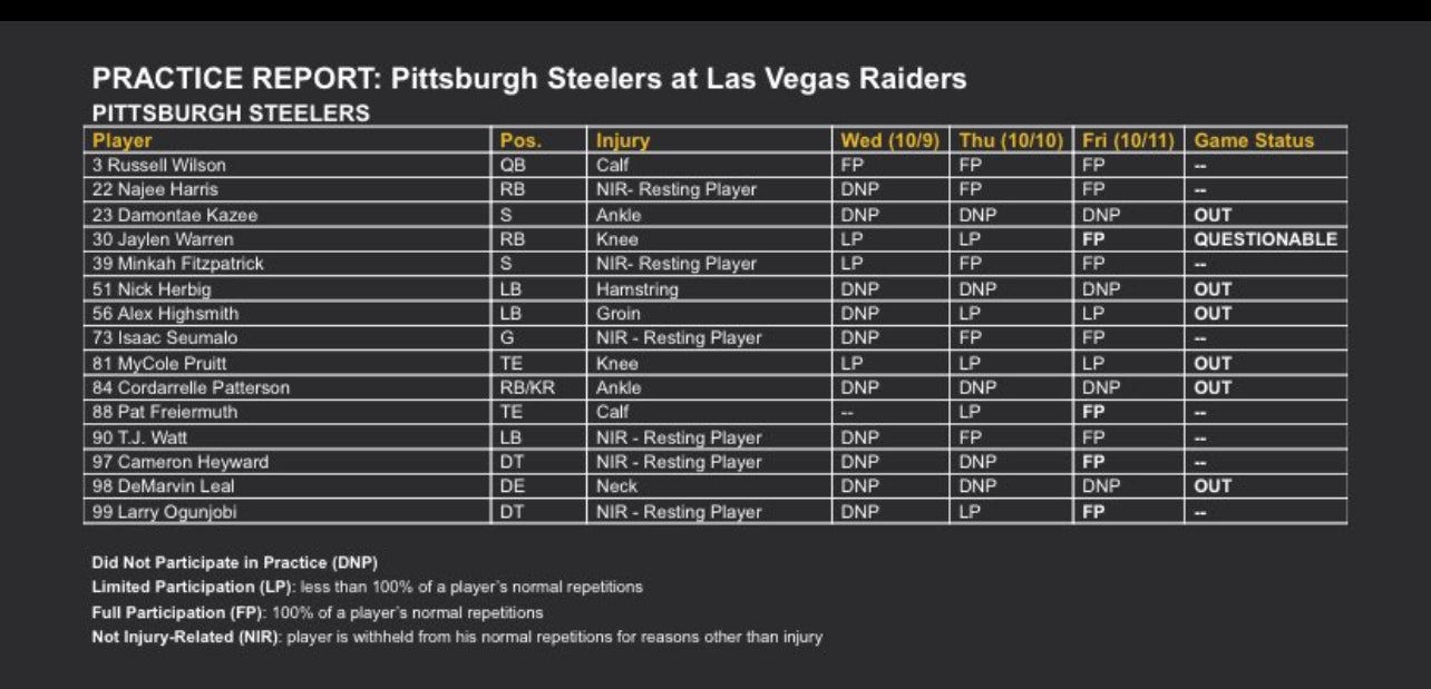 - RB Jaylen Warren: Still recovering from his hamstring injury, Warren is doubtful against Vegas according to HC Mike Tomlin, which was proven by his participation level on Wednesday. On Thursday, Warren was limited again but he practiced in full on Friday and is questionable heading into Sunday