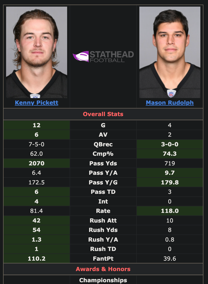 But Rudolph's win-loss record, yards per attempt and QB rating only tell part of the story as Pickett played with Matt Canada as the OC for the whole season before having arguably his best game as a pro in his first game after Canada was relieved from his duties.