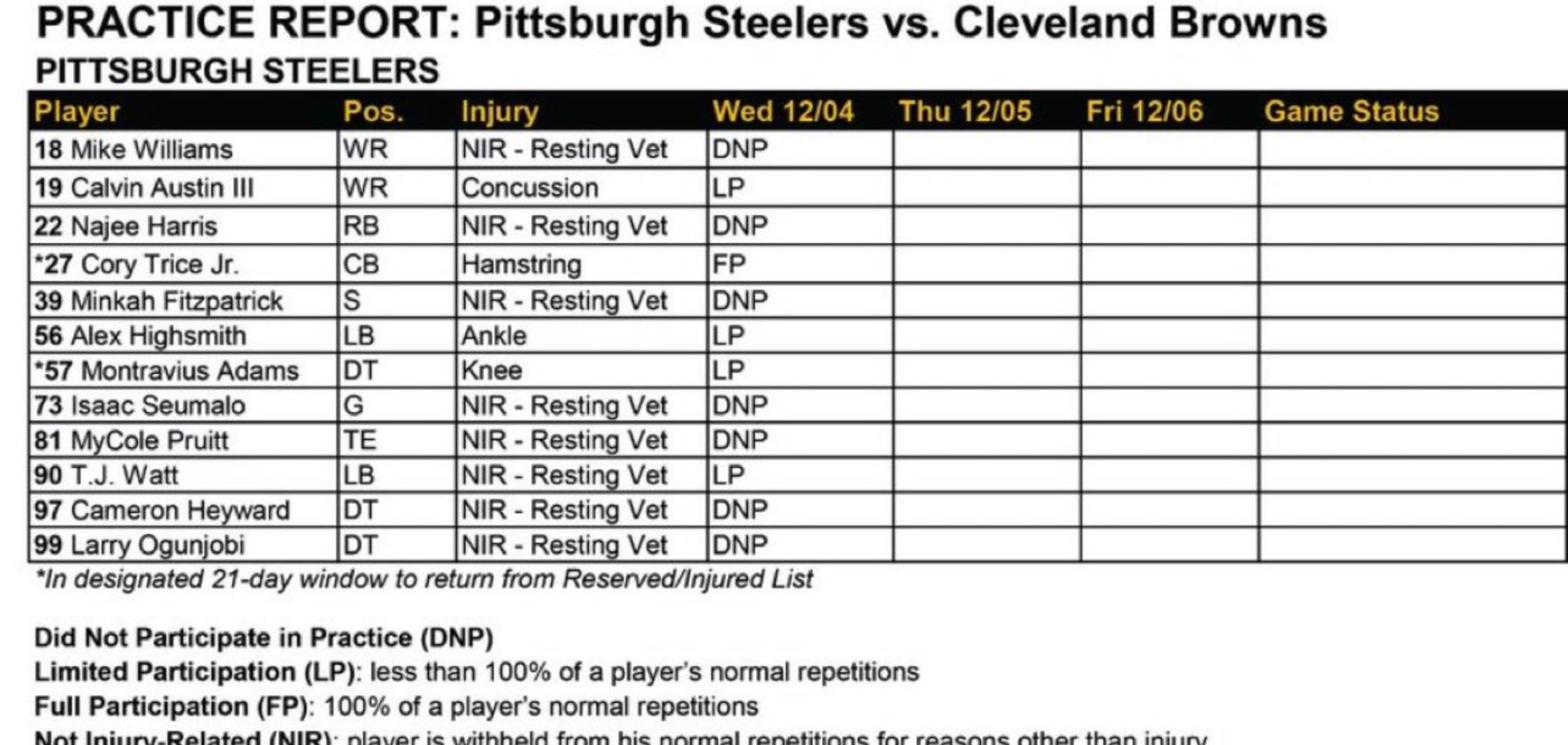 - Calvin Austin III: After suffering a concussion against the Cincinnati Bengals, and missing the end of the game, Austin was placed into the protocol. His limited availability is an encouraging sign for a player that has come to life in the third year of his Steelers tenure