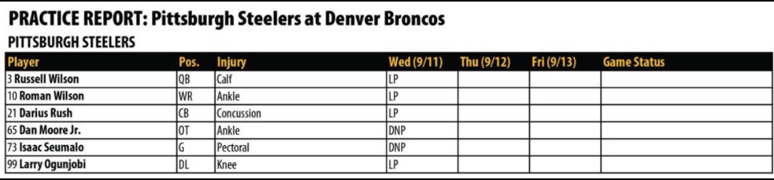 - QB Russell Wilson: After Coach Tomlin announced that the team was preparing for Justin Fields to start against the Broncos, it foreshadowed doubt on Wilson's return to the lineup. On Wednesday, Wilson was seen doing some light throwing and movement but that was the extent of his day.