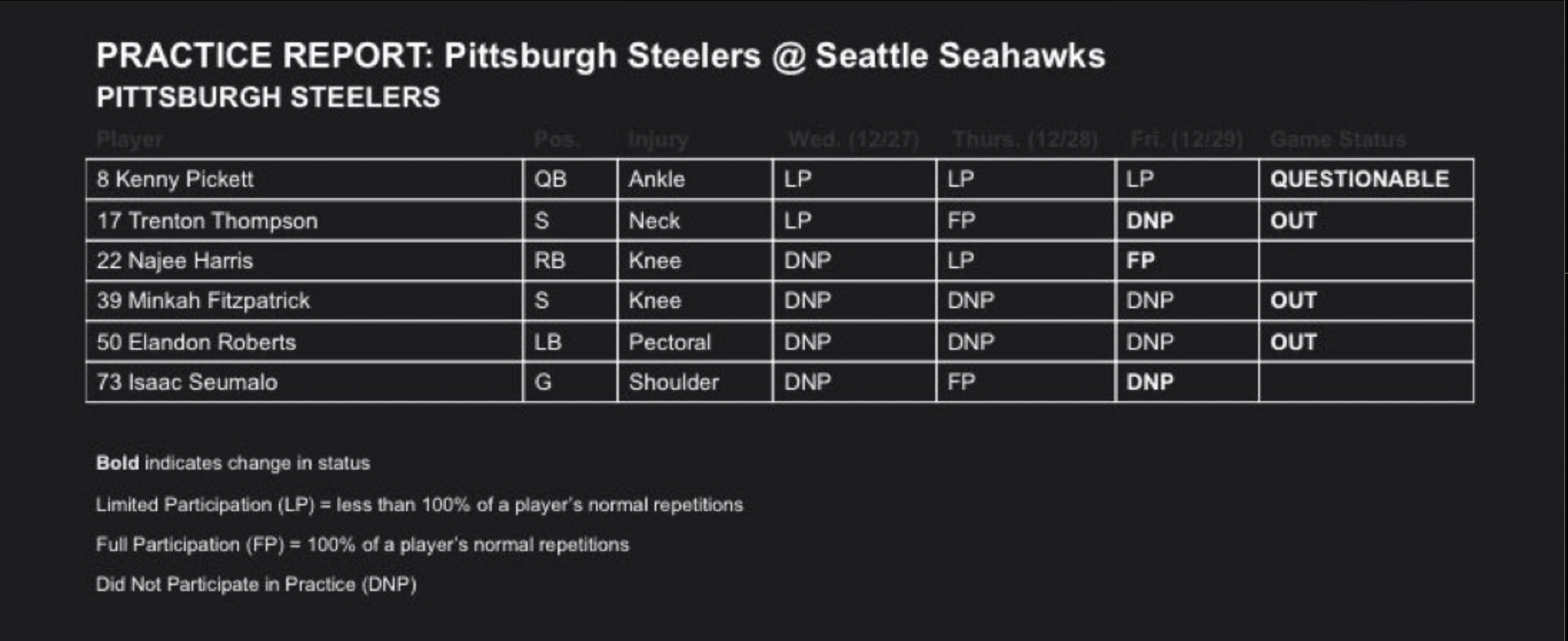 Steelers latest injury report, Week 17 at Seahawks