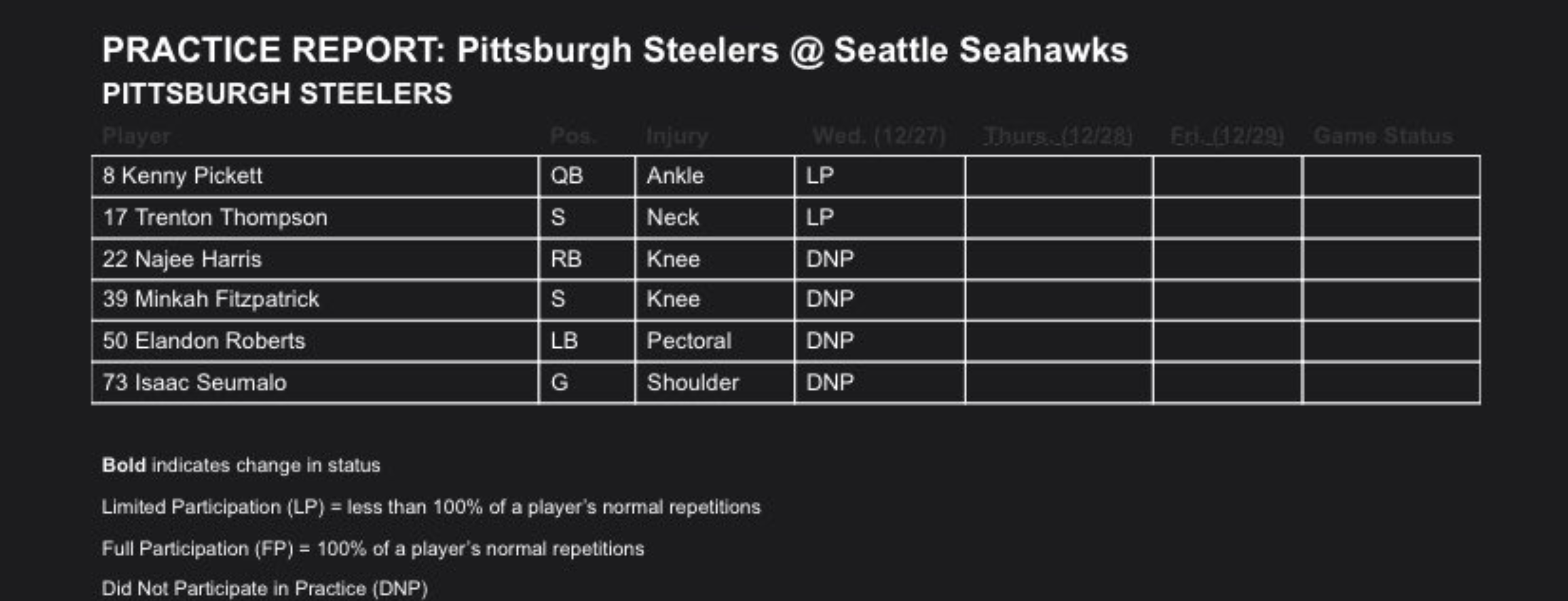• Kenny Pickett: Pickett returned to practice last week for the first time since ankle surgery but only in a limited capacity. This was followed by a report that Pickett would be ready to go for Seattle, with Coach Tomlin adding to the report saying: "We're in the same position with Kenny as last week, Mason will have the ball to start the week and we will see where Kenny is as the week goes on." On Wednesday, Pickett was seen moving around with ease and told the media he felt he could play this week. His practice status was limited, which is a positive sign for his development. We'll see if he can manage to practice in a full capacity and leave the Steelers with a tough decision to make.