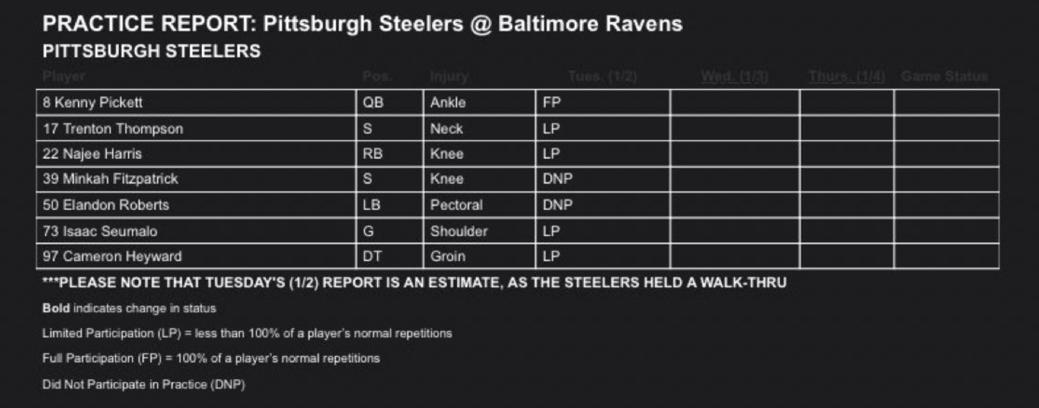 So if Pittsburgh wants to take the easiest path to the playoffs, it starts with a win in Baltimore and a healthy team. We received some info on the latter following Tuesday's practice: