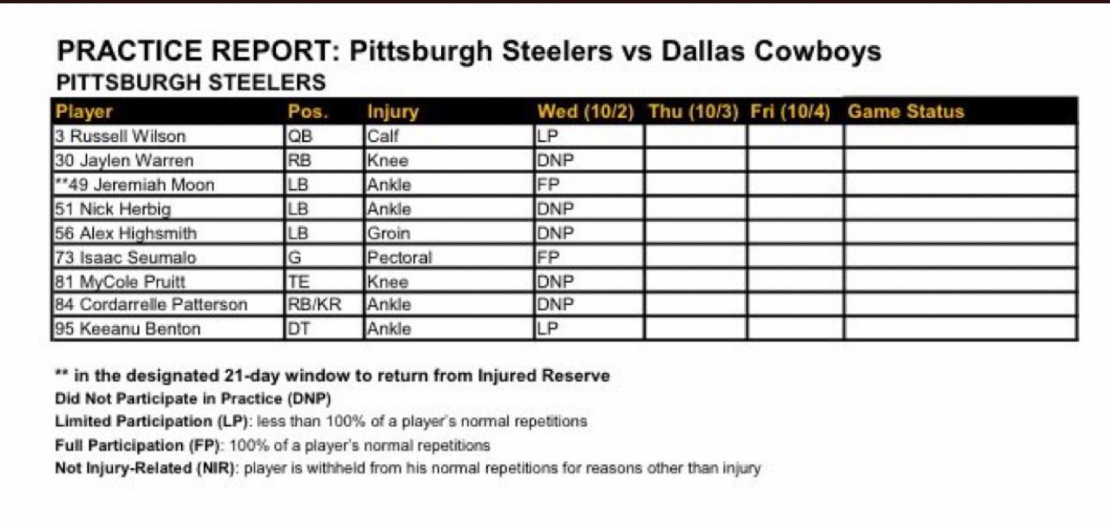 - QB Russell Wilson: Despite the statement from Mike Tomlin that Wilson would ramp up his participation level, Wilson was still limited on Wednesday.