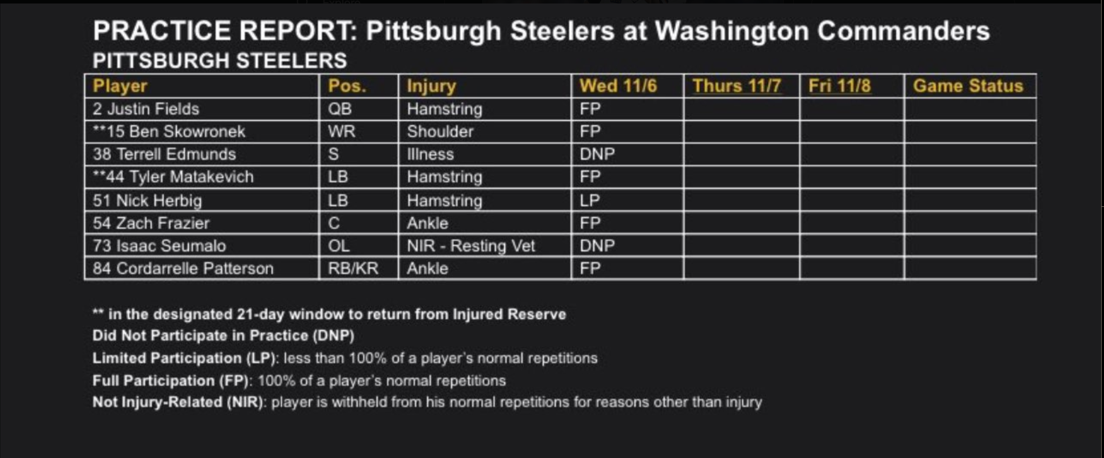 Steelers Week 10 Injury Report (Wednesday)