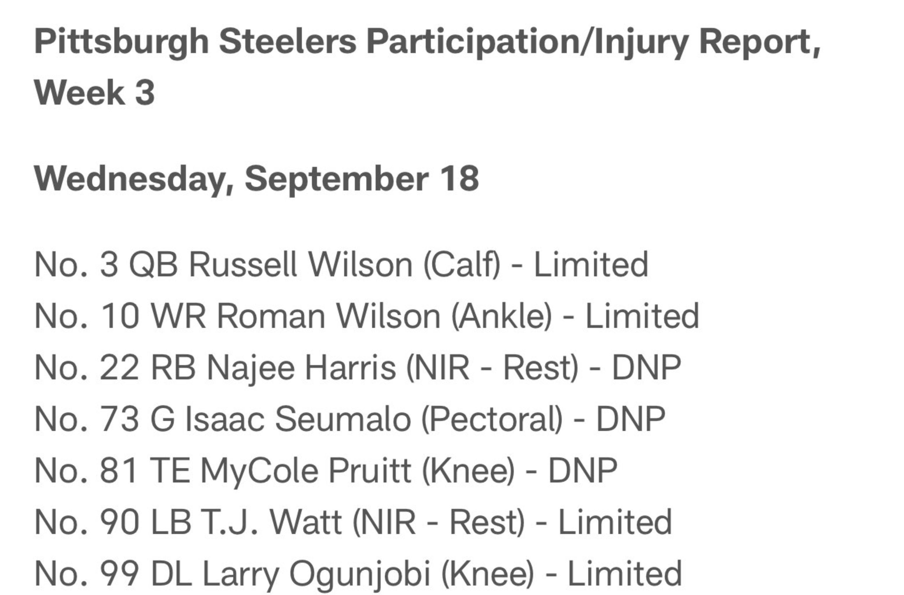 - QB Russell Wilson: As Tomlin told the media on Tuesday, the team is once again preparing for Justin Fields to start, which was backed up by Wednesday's report as Wilson was listed as a limited participant and was seen working on different concept compared to Justin Fields and Kyle Allen