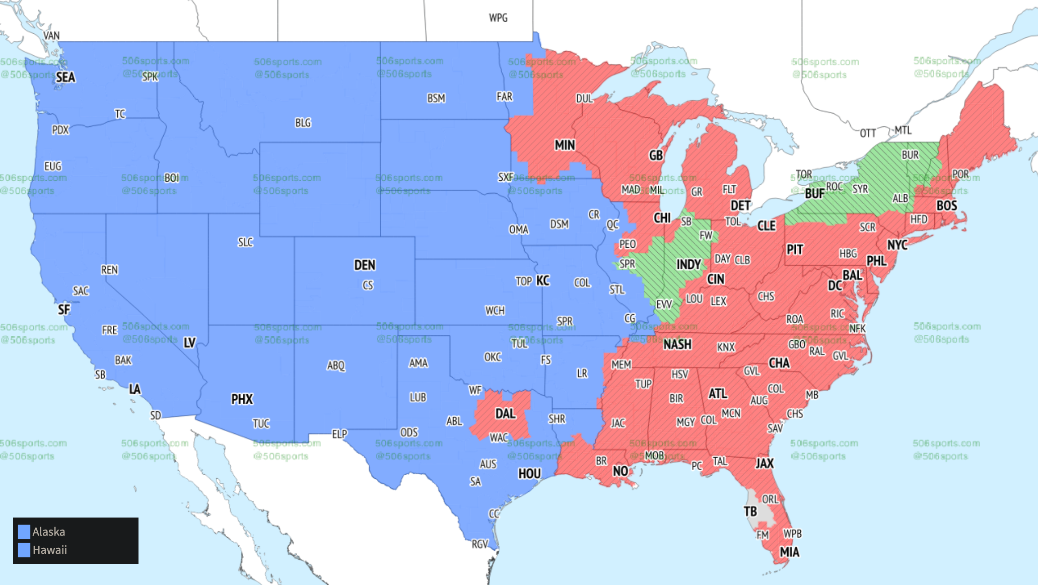 The Steelers, who are highlighted in red on the map are falling victim to the Kansas City Chiefs in terms of viewership, as the back-to-back champions (highlighted in blue) dominate the broadcast map for the CBS early window. They take on a 5-4 Denver Broncos team as they look to stay undefeated.