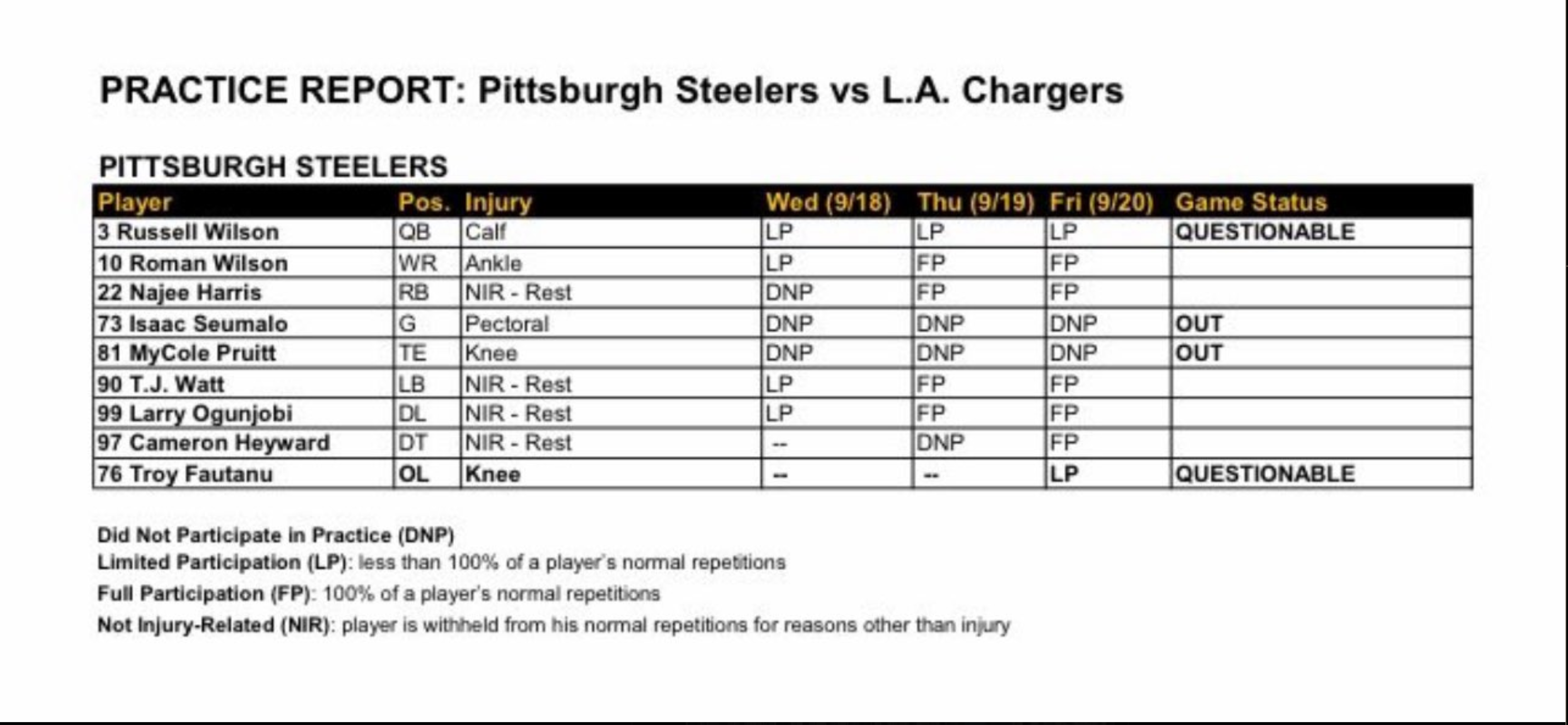 - QB Russell Wilson: As Tomlin told the media on Tuesday, the team is once again preparing for Justin Fields to start, which was backed up by Wednesday's report as Wilson was listed as a limited participant and was seen working on different concept compared to Justin Fields and Kyle Allen. On Thursday and Friday, Wilson was still limited, so no real surprise to see him listed as questionable