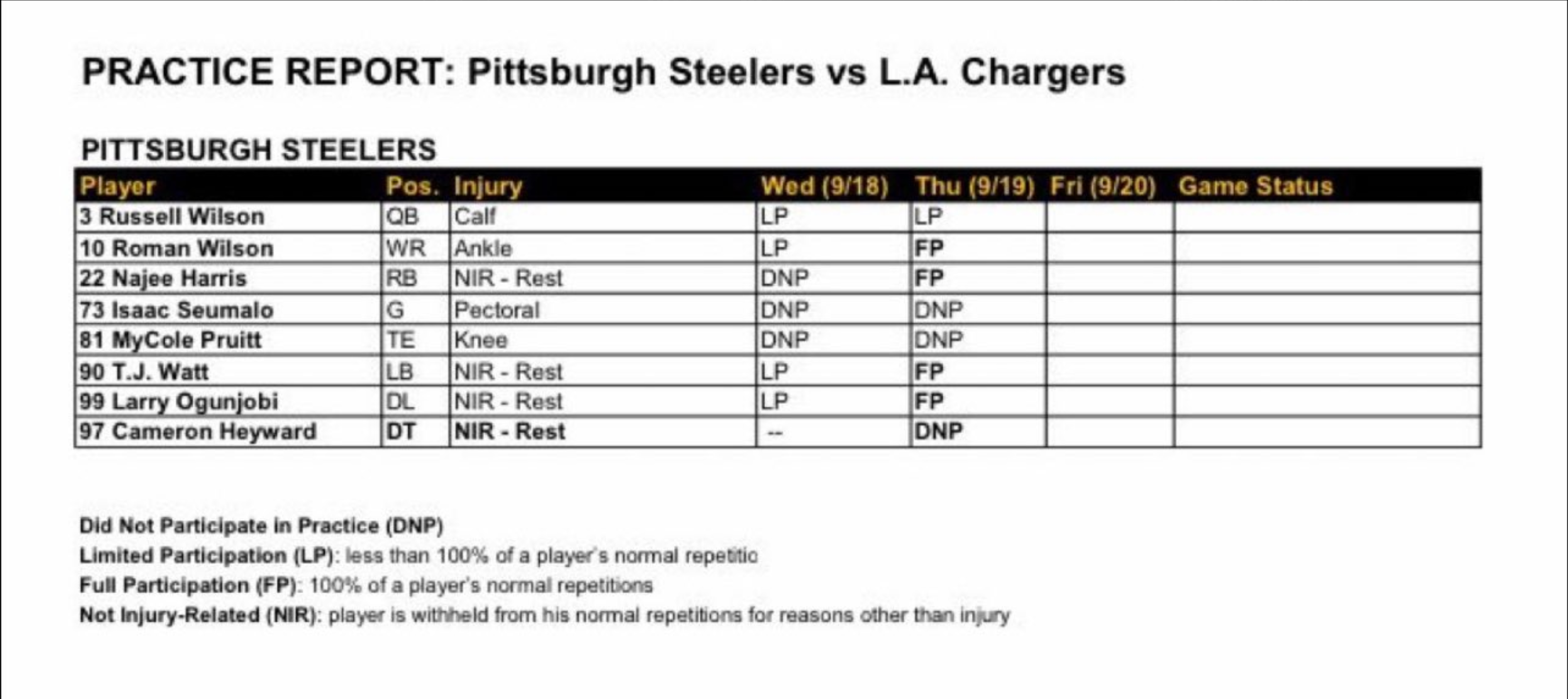 - QB Russell Wilson: As Tomlin told the media on Tuesday, the team is once again preparing for Justin Fields to start, which was backed up by Wednesday's report as Wilson was listed as a limited participant and was seen working on different concept compared to Justin Fields and Kyle Allen. On Thursday, Wilson was still limited, so no real surprise