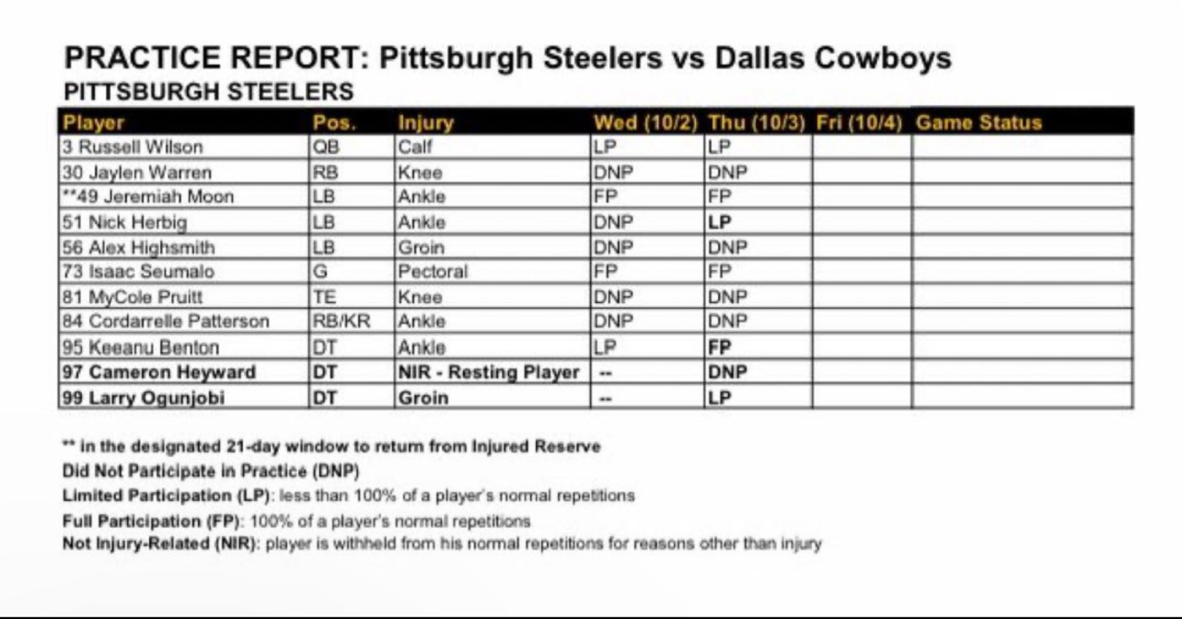• QB Russell Wilson: Despite the statement from Mike Tomlin that Wilson would ramp up his participation level, Wilson was still limited on Wednesday. Thursday was the same, leaving many to guess exactly what coach Tomlin meant by an increased workload in practice.