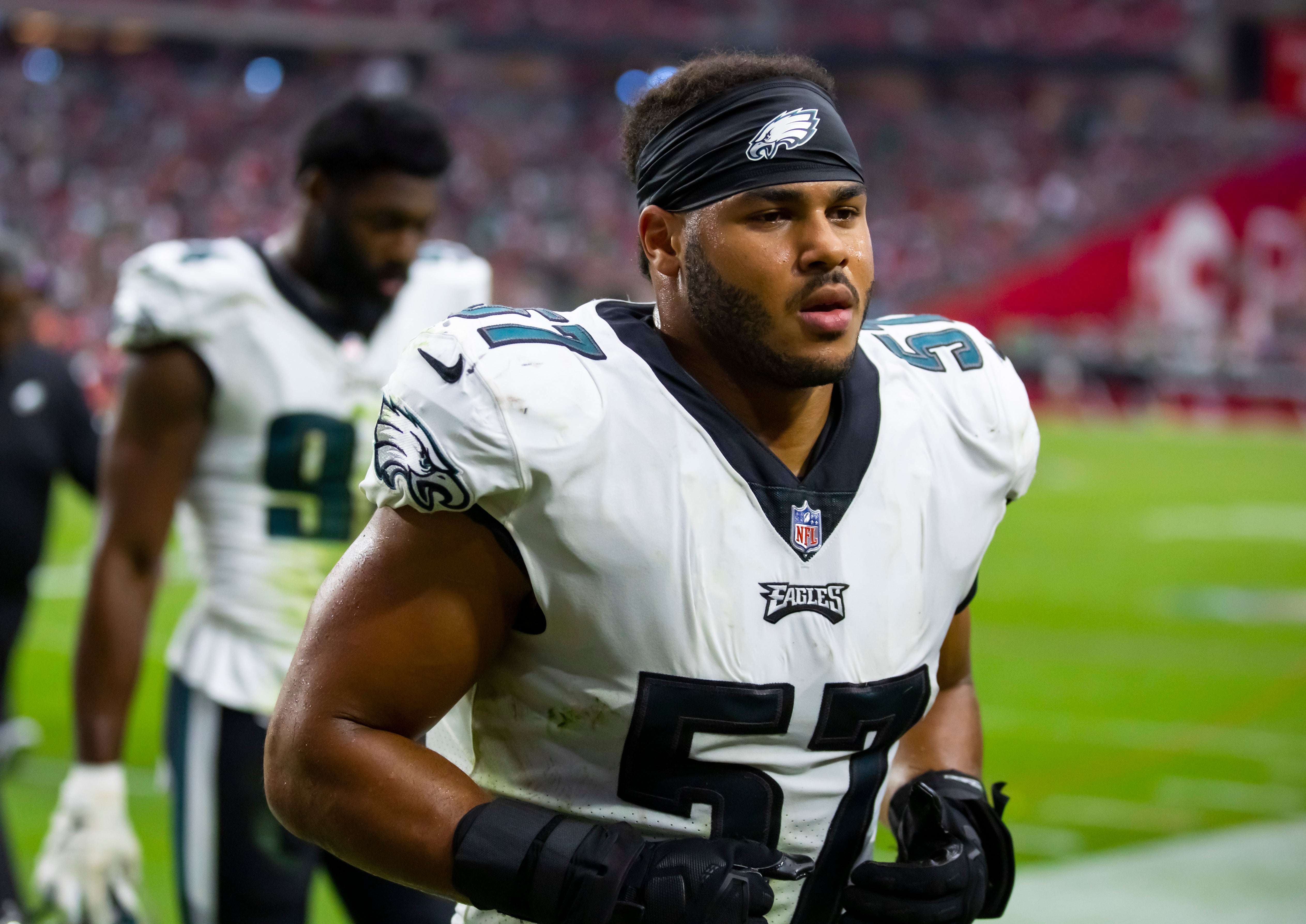 Oct 9, 2022; Glendale, Arizona, USA; Philadelphia Eagles linebacker T.J. Edwards (57) against the Arizona Cardinals at State Farm Stadium. Mandatory Credit: Mark J. Rebilas-USA TODAY Sports