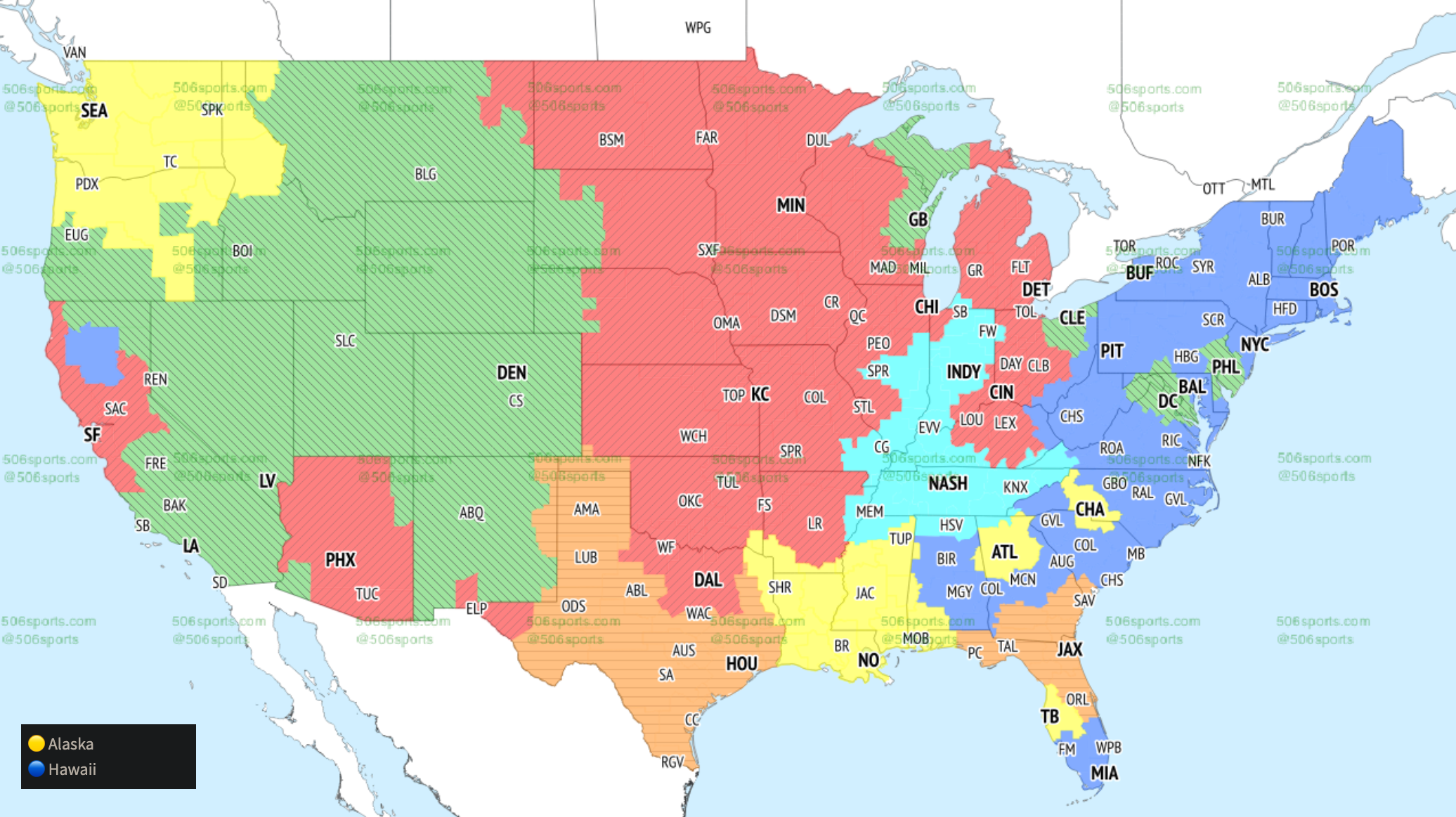 The Steelers at Patriots game is highlighed in blue. The majority of the Eastern Seaboard will be able to view this one, and it makes sense given the history of each franchise and their respective fanbases. That’s before we even get into the Mike bowl that is Vrabel against Tomlin.