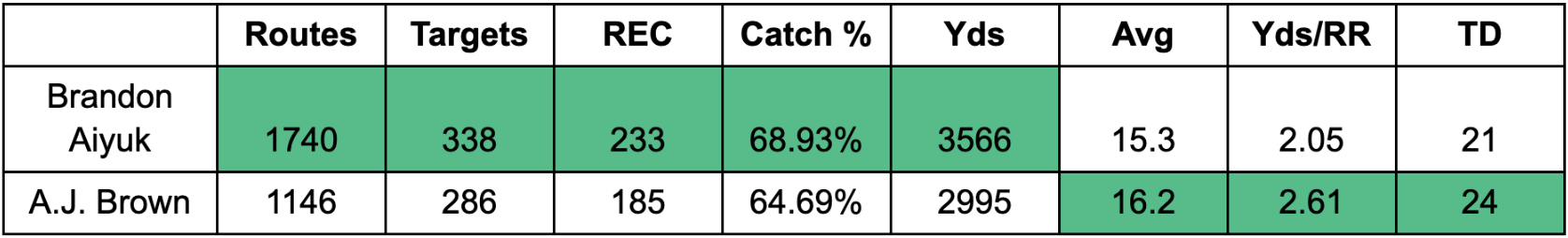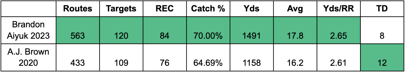 Aiyuk can reasonably argue that he is improving in volume stats while also leveraging his efficiency metrics up to Brown’s level.