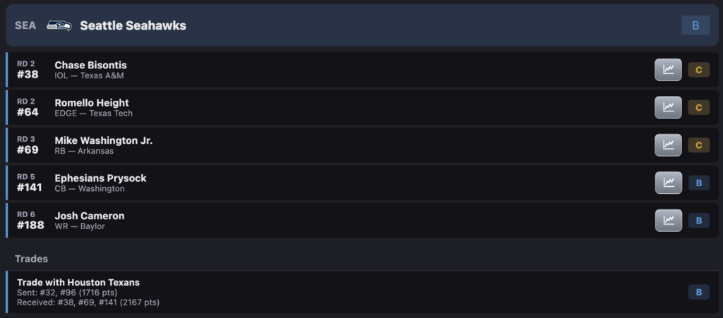 The Seahawks dropped six spots from 32 to 38, but jumped from 96 to 69 in Round 3. They added the first pick of the fifth round in this trade. Now, the Seahawks own picks 38, 64, 69, 141, and 188 in this mock draft.