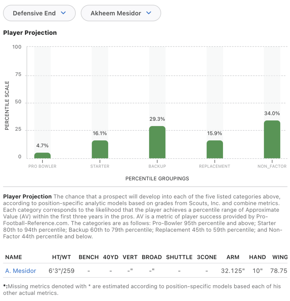 Per ESPN, Mesidor has a 16.1% chance of becoming a starter and a 4.7% chance of getting to Pro Bowler level. In all, he has a 20.8% chance of playing starting football on a regular basis.