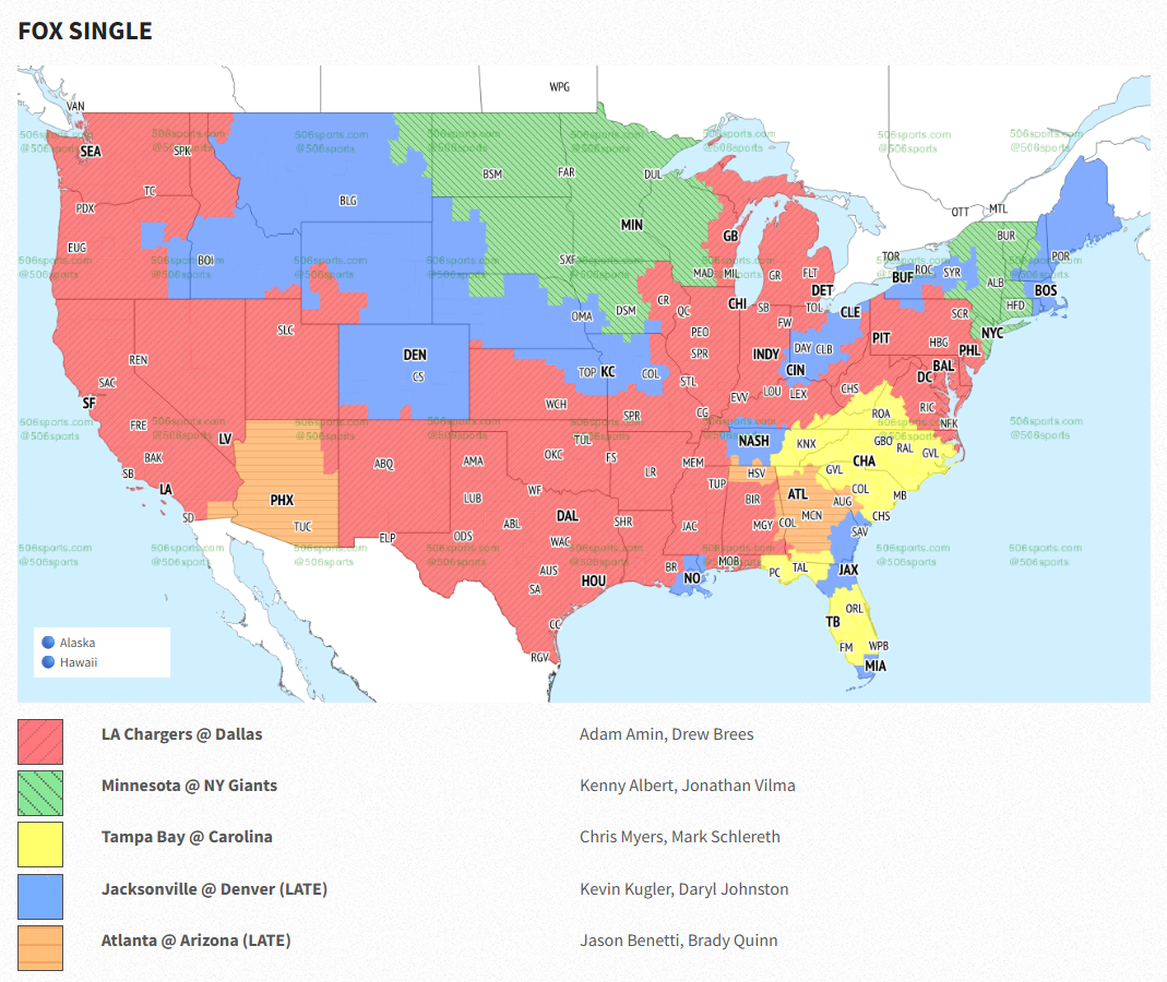 506 Sports has the answer to the latter question. The game will be shown in the early window on FOX with Chris Myers and Mark Schlereth on the call and will be shown throughout parts of the Southeast.