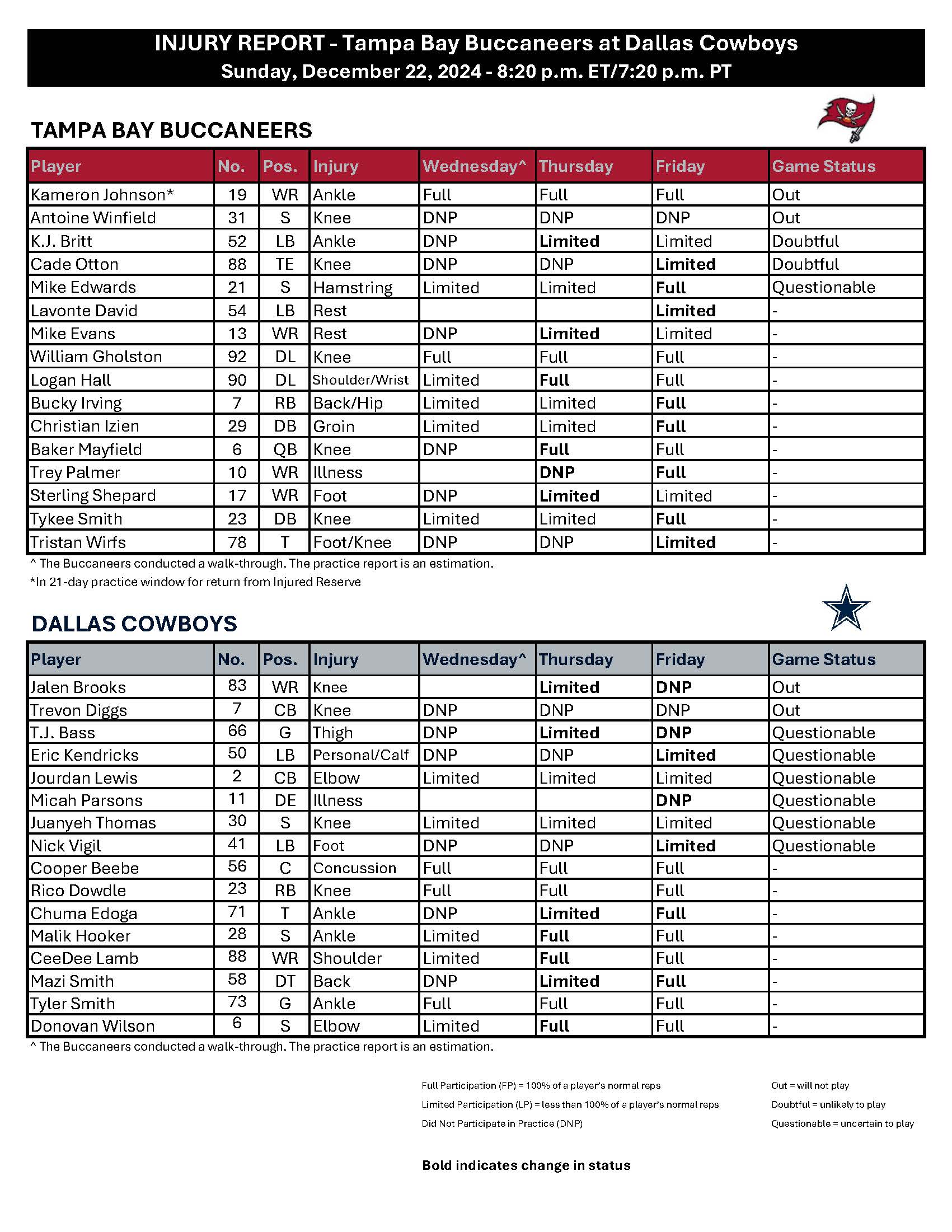 Mostly. Tampa Bay appears likely to be without a key part of their offense in Cade Otton, who is listed as doubtful with a knee injury. He was unable to practice all week. Todd Bowles mentioned him on Friday as being a game-time decision, but being listed as doubtful rather than questionable seems to have him trending in the wrong direction.