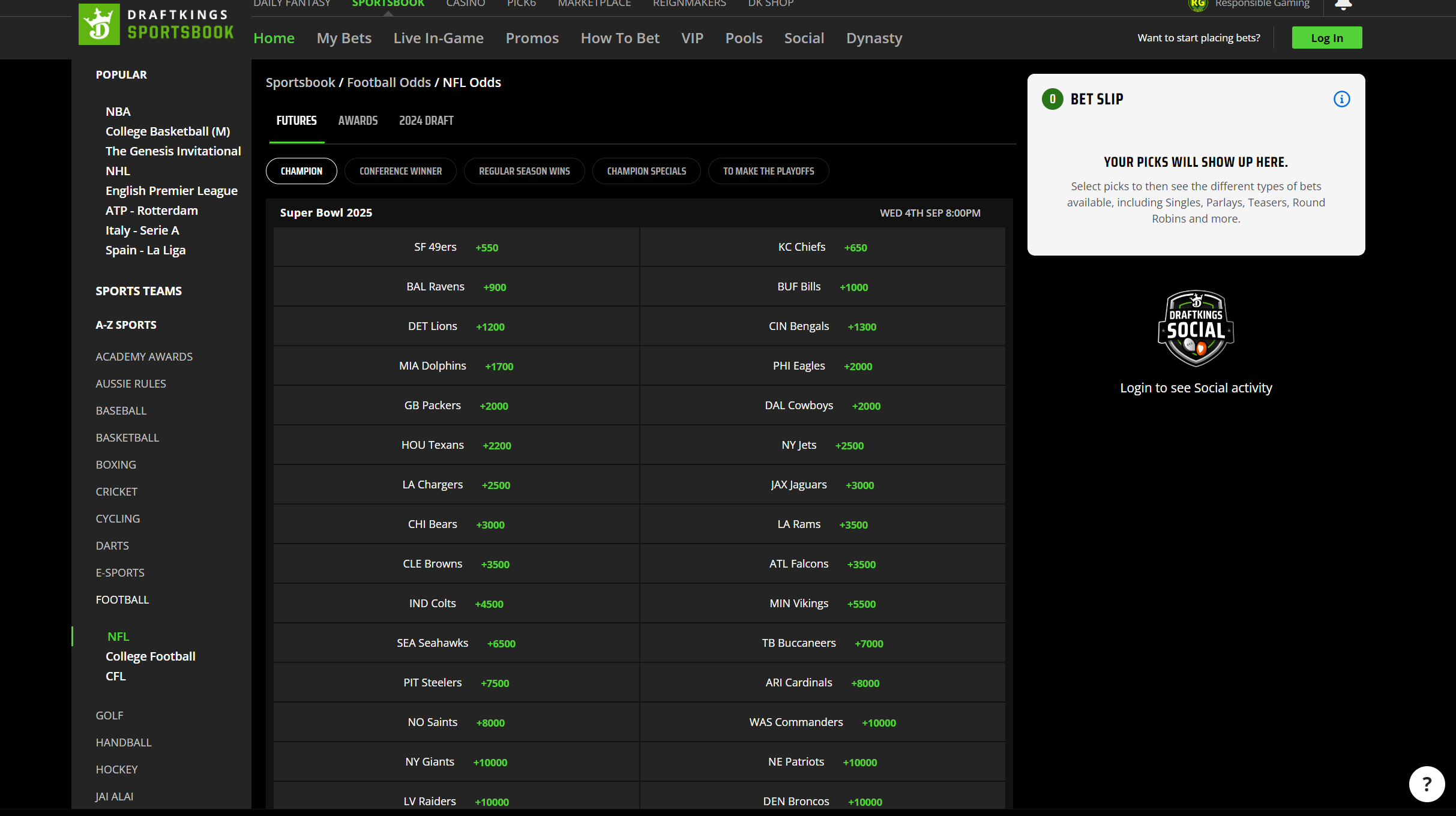 The list of teams who are above them is quite surprising. The Chicago Bears – who could be starting a rookie QB in Caleb Williams – are at +3000. The NY Jets are +2500 in a very difficult AFC East – and AFC, for that matter.