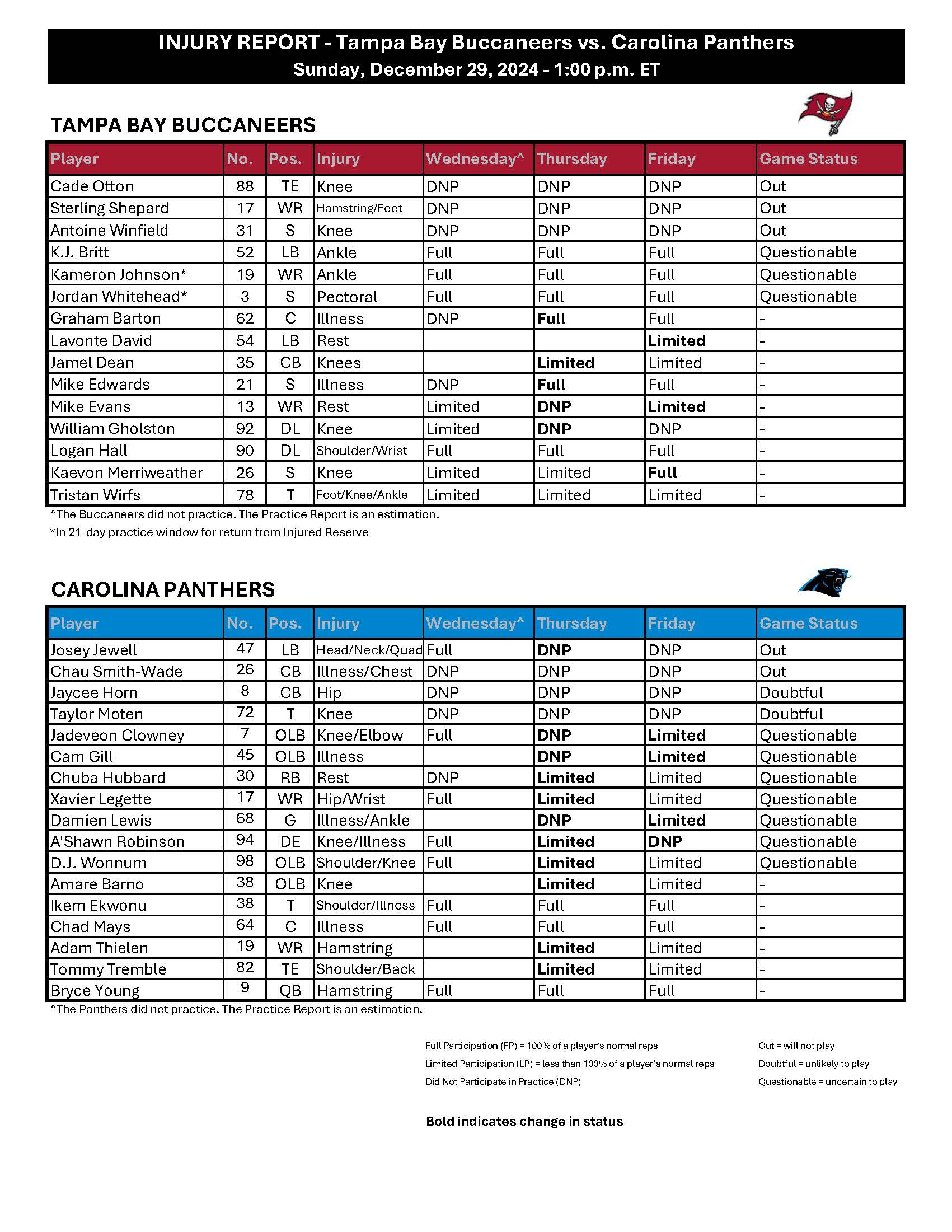For the rest of the report, Antoine Winfield, Jr., Cade Otton, and Sterling Shepard have all been ruled out.  K.J. Britt and Kam Johnson have been listed as questionable.