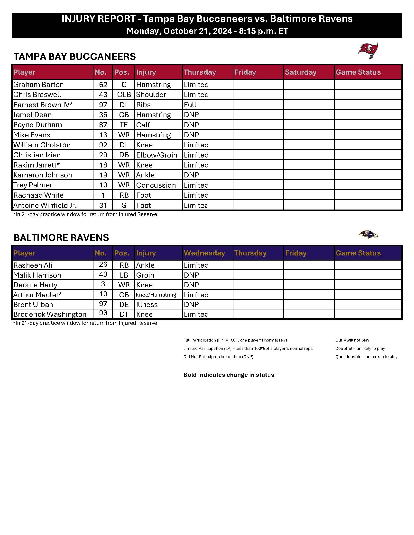 A return to the field on Thursday in even a limited capacity would be a positive sign for Evans' availability in primetime against Baltimore. We'll find out as the week goes on.