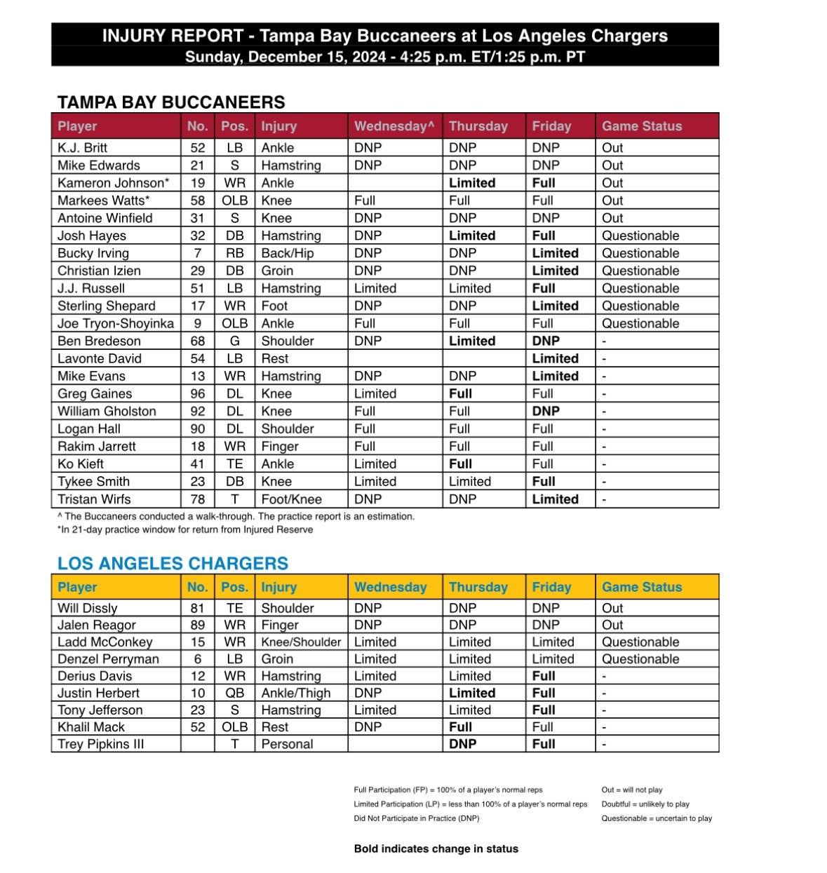 The Tampa Bay Buccaneers' Friday injury report looks like a CVS receipt. With 21 players on the final report, the Bucs are one of the most banged up teams in the entire league.