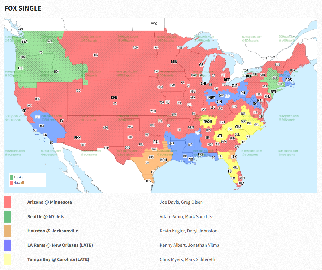 Beyond the aforementioned areas, Bucs fans in parts of Virginia as well as northern and southern Georgia and the middle Tennessee areas will be pleased, as those regions will have the game.  Outside of that, Tampa Bay fans will need to find someone with the NFL Sunday Ticket or a sports bar in order to get the game.