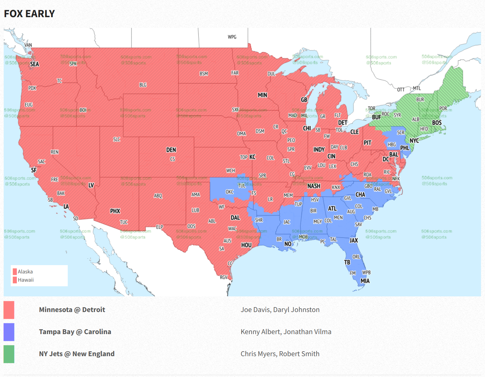 The game will be on across the South, from the Ark-La-Tex region east through almost all of North Carolina and into Virginia. It makes sense that it would be on TV in areas where Saints and Falcons fans will be watching. The Saints and Falcons both need Tampa Bay to lose in order to have a chance at winning the division.
