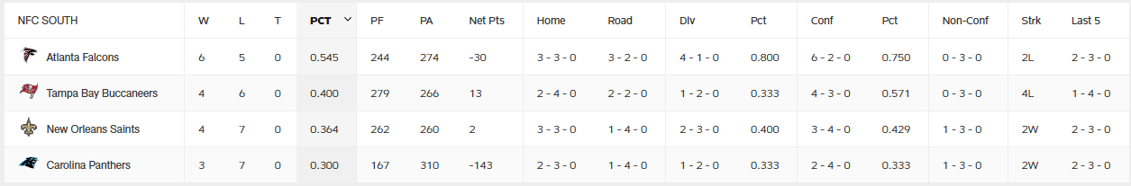 As such, the path to the NFC South remains one that's very possible for the Buccaneers.  In fact, out of all teams in the NFL.com playoff predictor that are on the outside looking in, the Bucs have the best playoff percentage chance right now at 41%.  Again, that's largely due to their proximity to the Falcons for the division lead.  The Falcons also have games coming up the next two weeks against the 7-3 Los Angeles Chargers and at the 8-2 Minnesota Vikings.