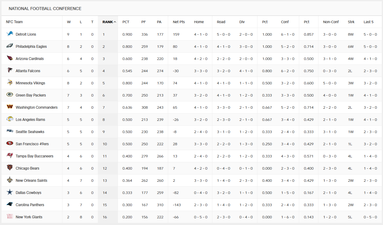 Seattle snatched a late victory from San Francisco, knocking the 49ers down to 5-5.  Since they hold the head-to-head tiebreaker over the Bucs by virtue of their Week 10 win, Tampa Bay needs to see San Francisco either win the NFC West or fall below them in the wild card standings.