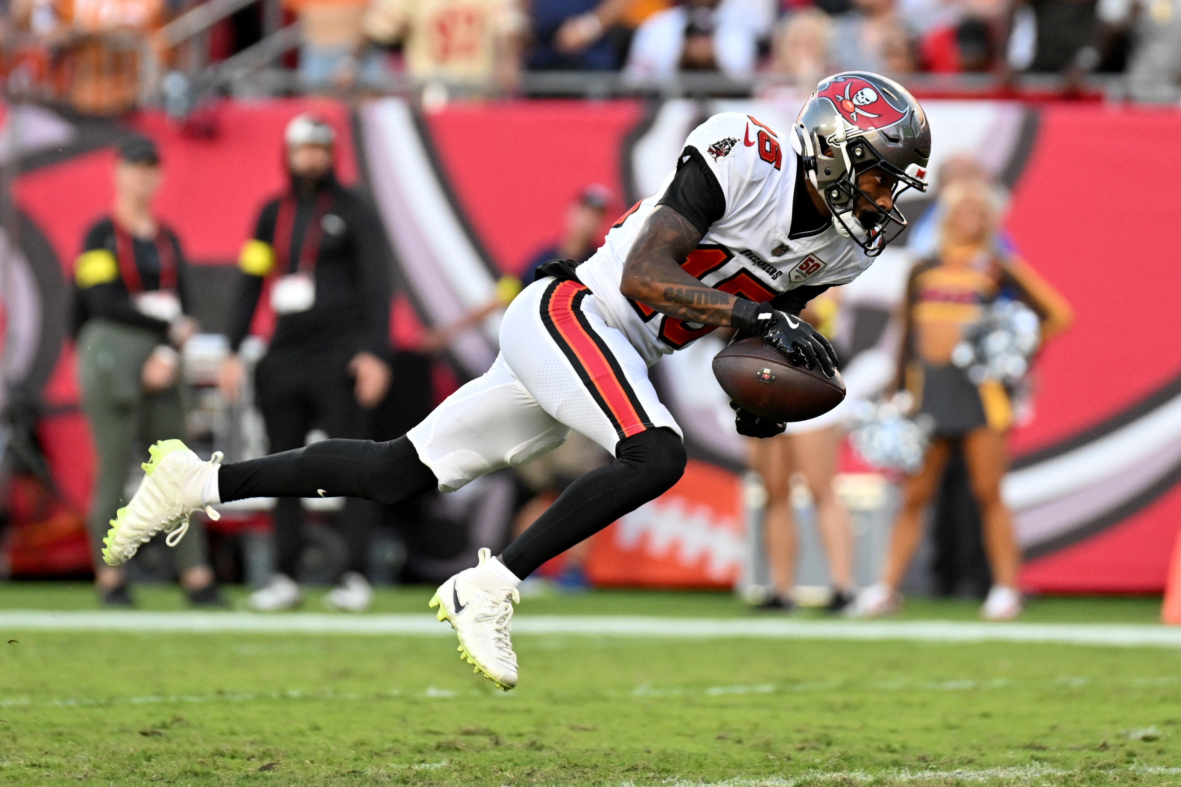 “Normally, Tez is supposed to go across the field, but he recognized a little bit of a hole and void in the coverage, so he took it,” Baker Mayfield told reporters after the game. “And you can see him put his hand up on, probably on the replay, or whatever it is, and [it was] just a great adjustment by him. [I was] just trying to give him a chance. And he caught up to that ball and made a great catch.”