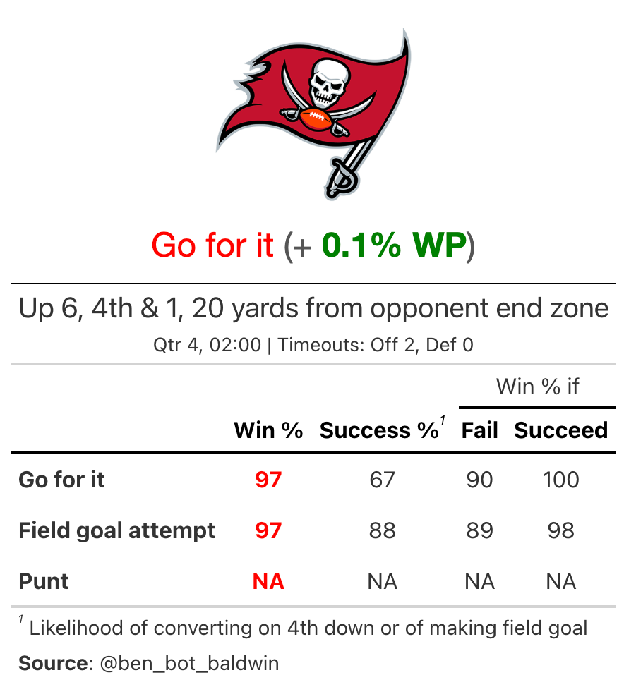 According to RBSDM, going for it would’ve been the better decision, although barely. As you can see below, it would’ve given the Bucs a 0.1% better chance of winning the game and they still would’ve had a 90% chance of winning if they didn’t convert.