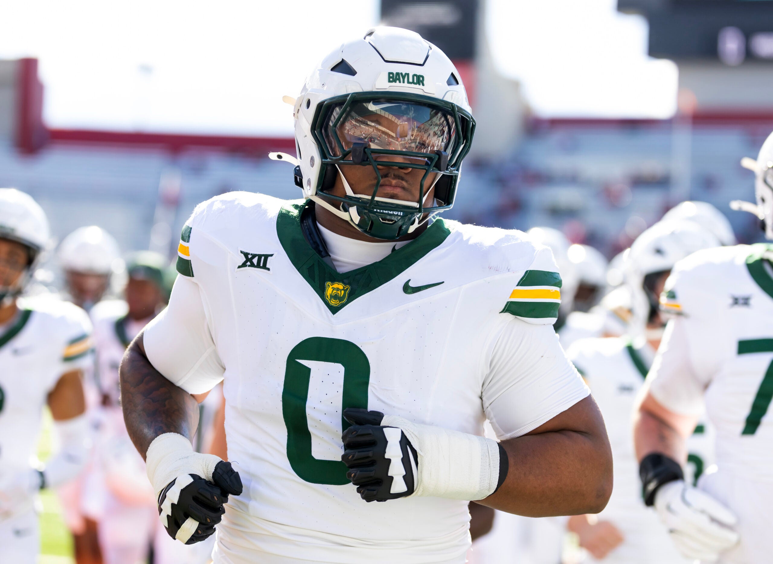 Nov 22, 2025; Tucson, Arizona, USA; Baylor Bears defensive lineman Jackie Marshall (0) against the Arizona Wildcats at Casino Del Sol Stadium. Mandatory Credit: Mark J. Rebilas-Imagn Images