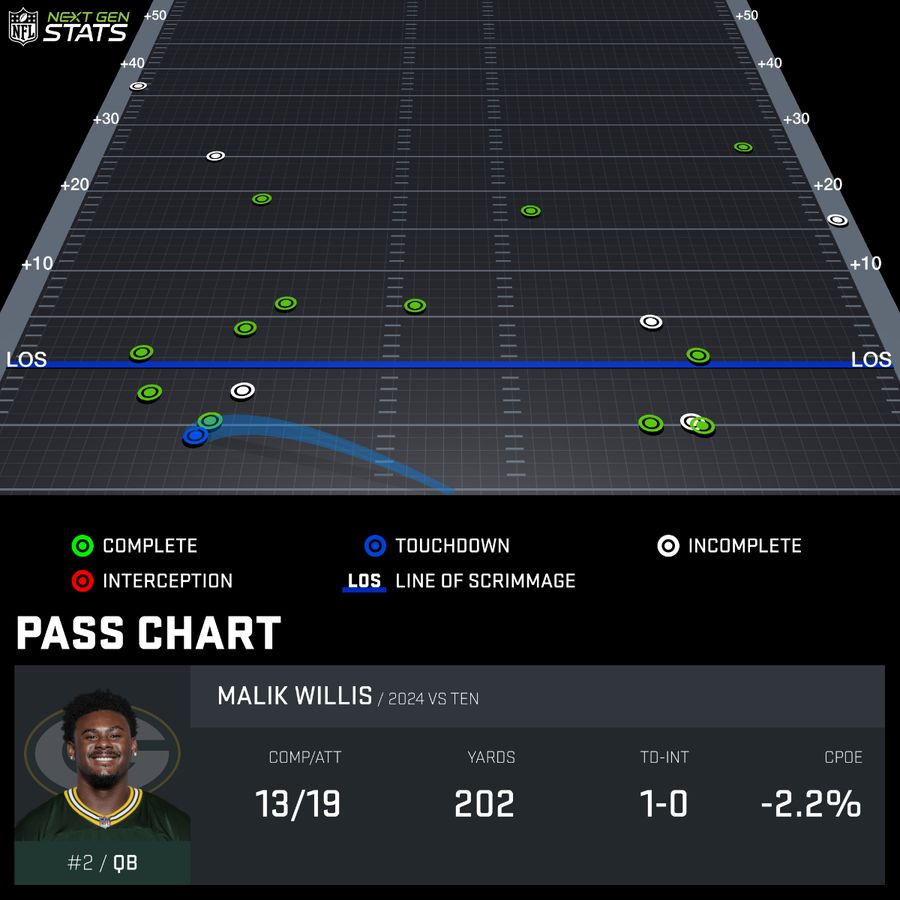Take a look at Willis' passing chart courtesy of Next Gen Stats. The three completions beyond 10 yards are the plays I want to emphasize my praise for. Those were all big time passes, mostly on pivotal downs, where he trusted his receiver to make a play and put the ball in the right place to enable them to make it. 10 out of 10, no notes.