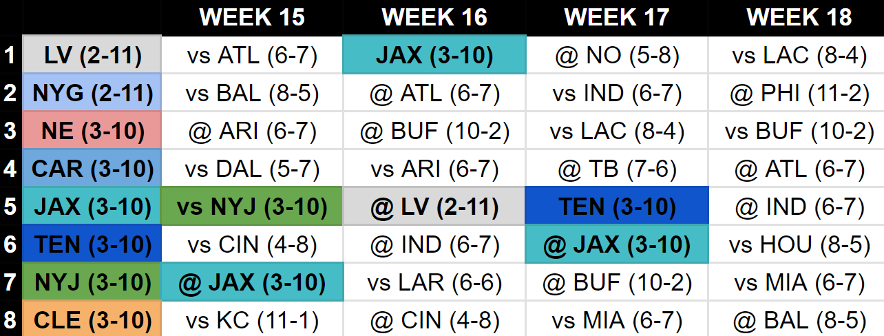 In that same scenario, if the Raiders beat the Jaguars in Week 16, the Titans would move ahead of the Jaguars and Raiders to pick 4th overall.