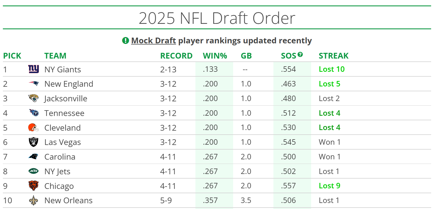 Besides the Jaguars, the Titans remain behind Giants and the Patriots as well. New York has been executing a masterful tank for months now, rotating bad QBs and killing themselves with hilarious blunders in key spots. Their remaining opponents are the Colts and Eagles, and they'll be significant underdogs in each matchup.