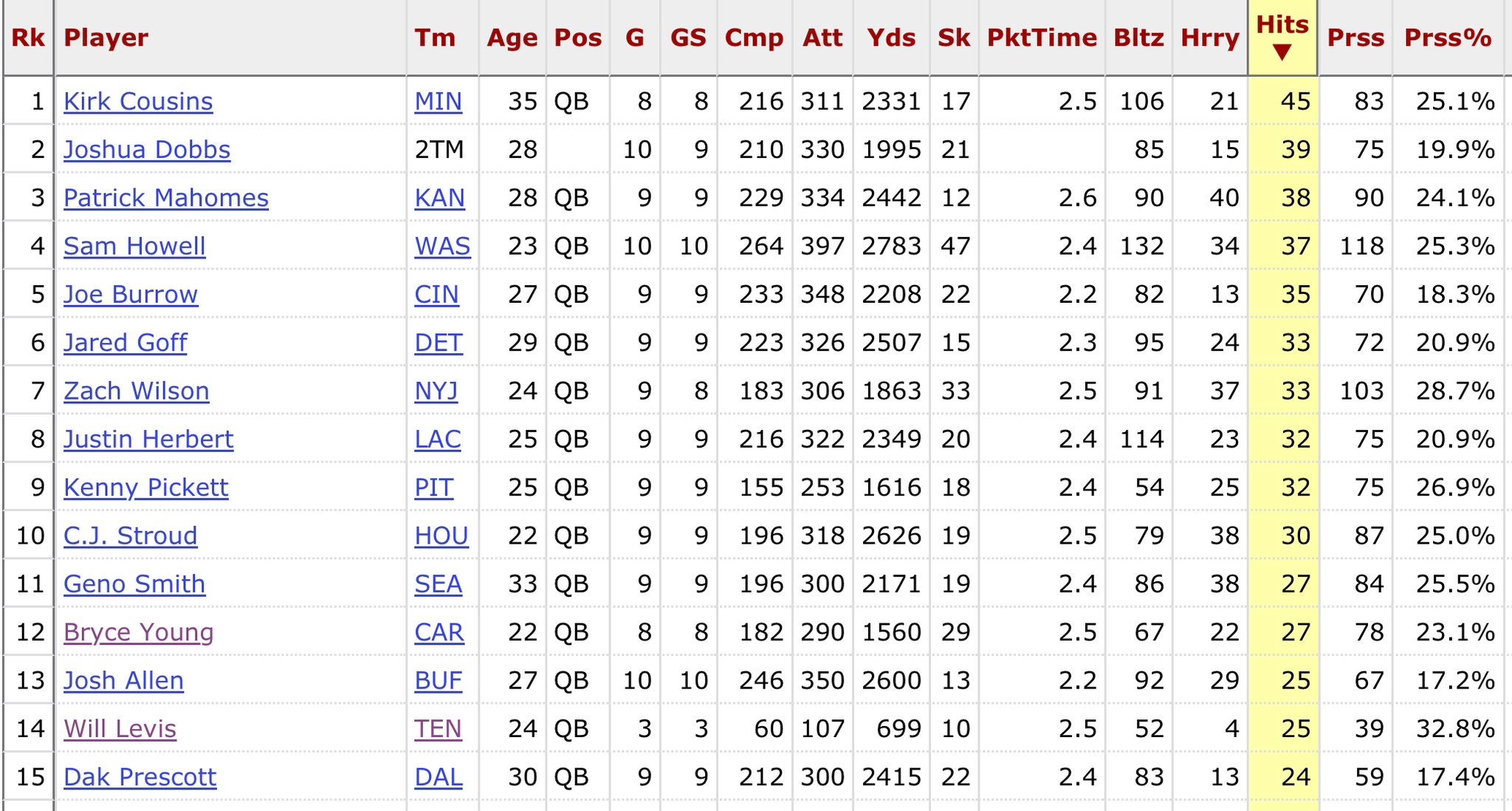 For comparison, no other QB hit that many times or more has started less than eight games this season. Cowboys QB Dak Prescott has been hit once less in six more games.