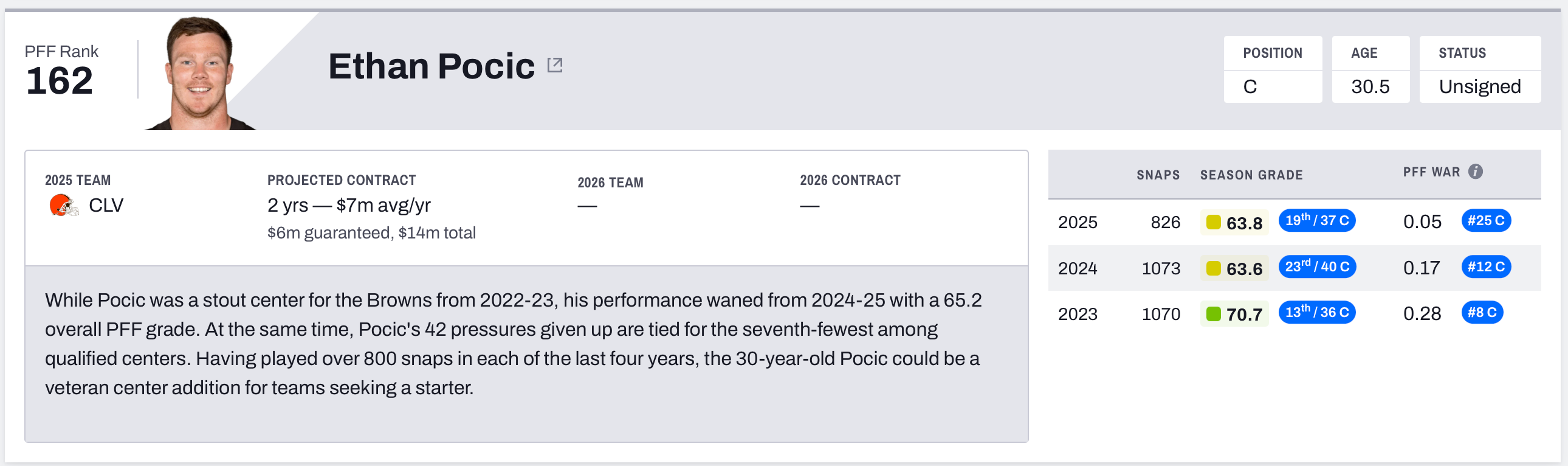 Jenkins just turned 30, but he’s been stellar when he plays. He’s only allowed three sacks in the last three seasons. He played primarily left guard for the majority of his career and made the Pro Bowl in 2020 and 2022. The Packers moved him to center in 2025, and he could be the Commanders’ next center, or Chris Paul’s replacement if he doesn’t stay in Washington. Jenkins may want the most out of all of the options, but also could be the most valuable.