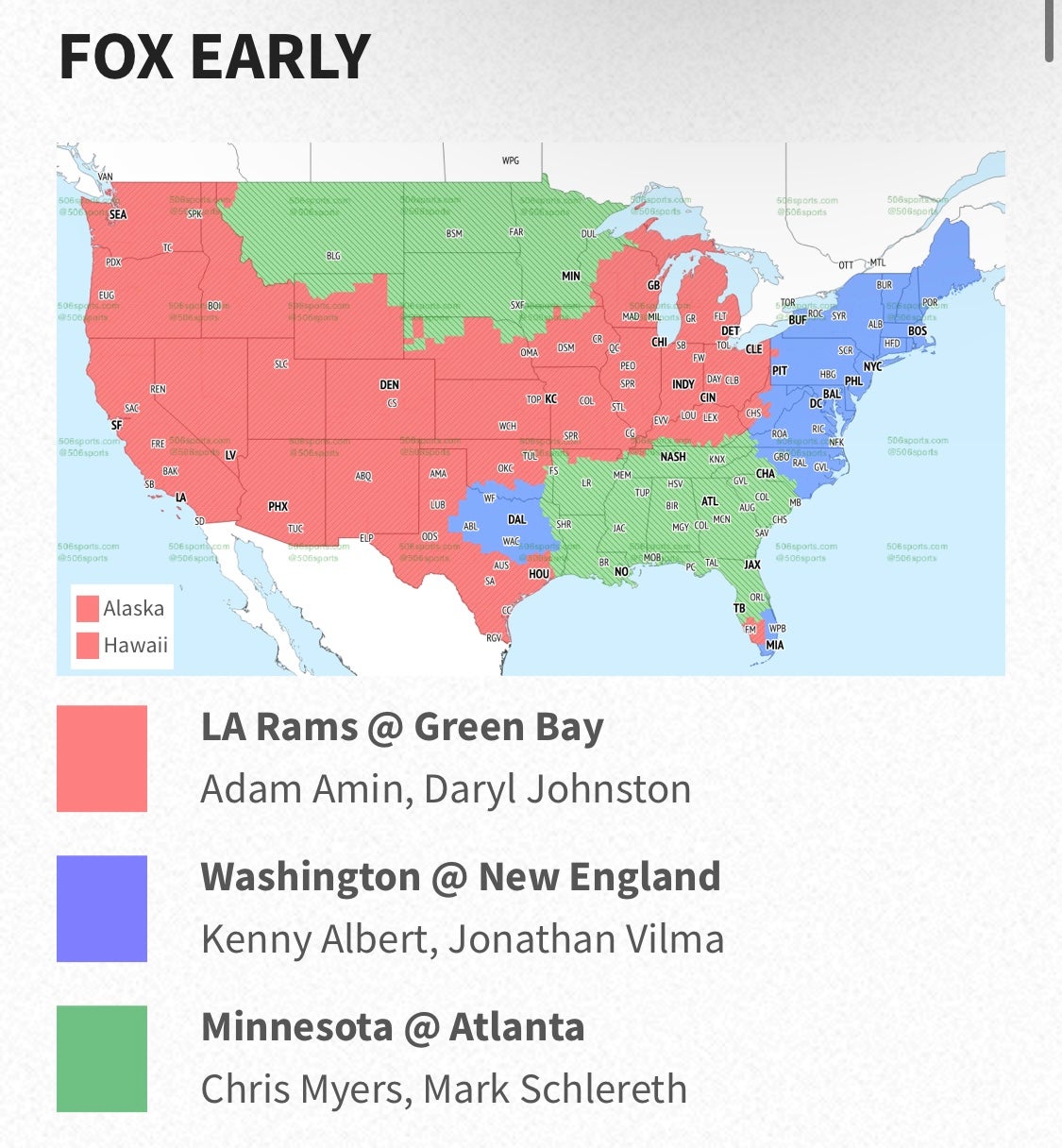 Much of the country will see the Los Angeles Rams at Green Bay Packers on Fox during the early slate of games. The Minnesota Vikings and Atlanta Falcons game will be seen by a large part of the country as well.