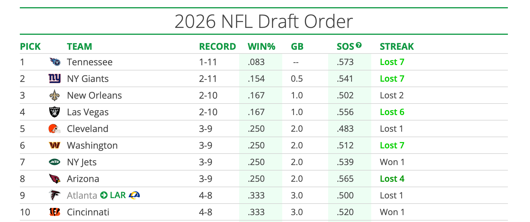 This team will continue to fight down the final stretch, but they’re still projected to keep losing in the final five games and land a top draft pick. After losing to the Broncos, the Commanders are 3-9 and have one over the lower strength of schedules, giving them an advantage and the sixth overall pick.