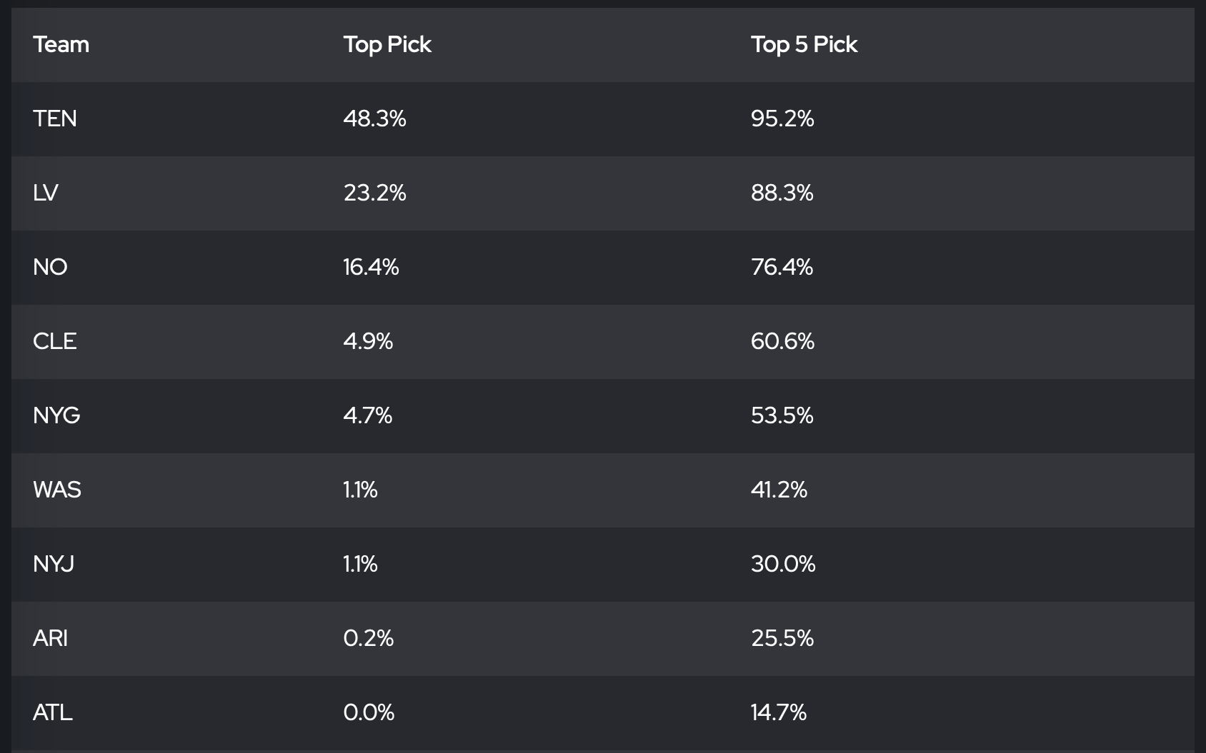As it stands heading into Week 14, the Commanders have a 41.2% chance of landing a top-5 pick, which is just behind the Giants, who they play in two weeks.
