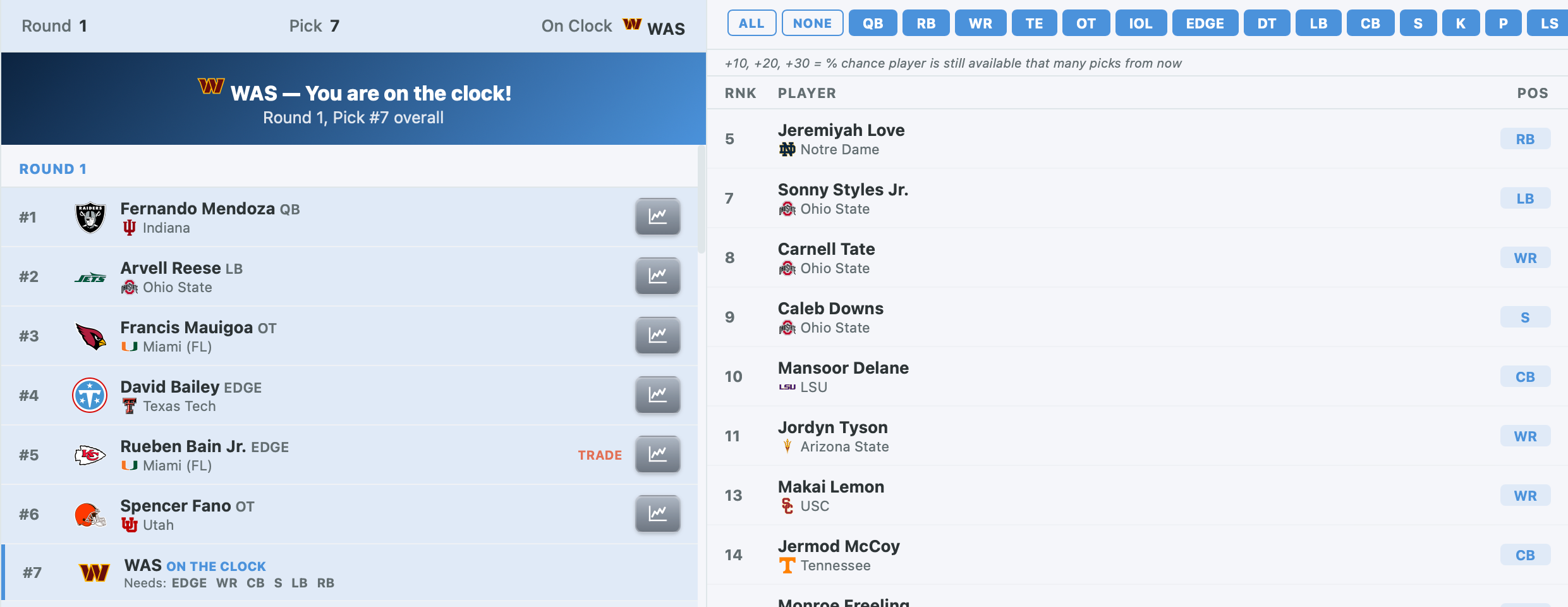 Now here is where the board needs to fall perfectly. The Arizona Cardinals taking an offensive tackle or an EDGE is the best-case scenario, and picking Francis Mauigoa would help the Commanders a ton. Letting David Bailey and Rueben Bain fall helps the next few picks.